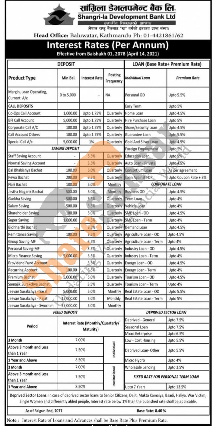 Shangri-la Development Bank Limited has published a notice regarding the new interest rate for deposit and loan products and it's effective from 1st Baisakh, 2078.