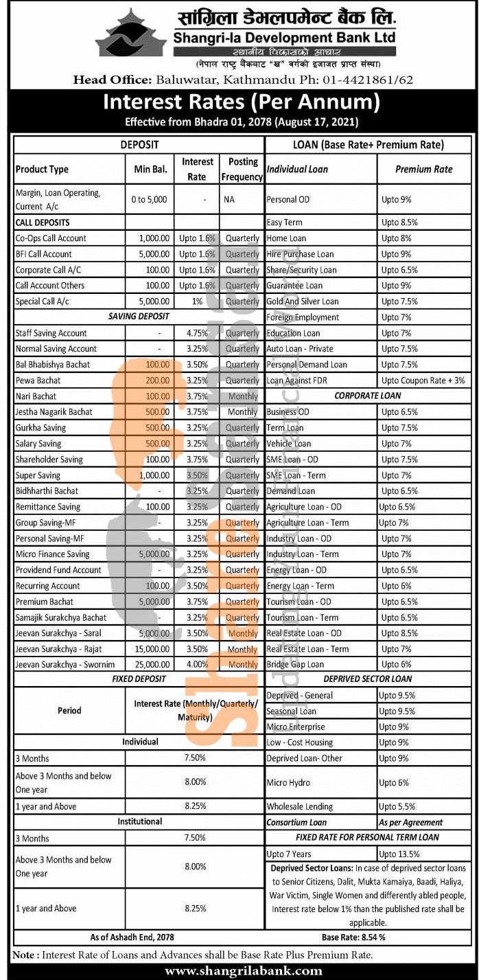 Shangri-la Development Bank Limited has published a notice regarding the new interest rate for deposit and loan products and it's effective from 1st Bhadra, 2078.