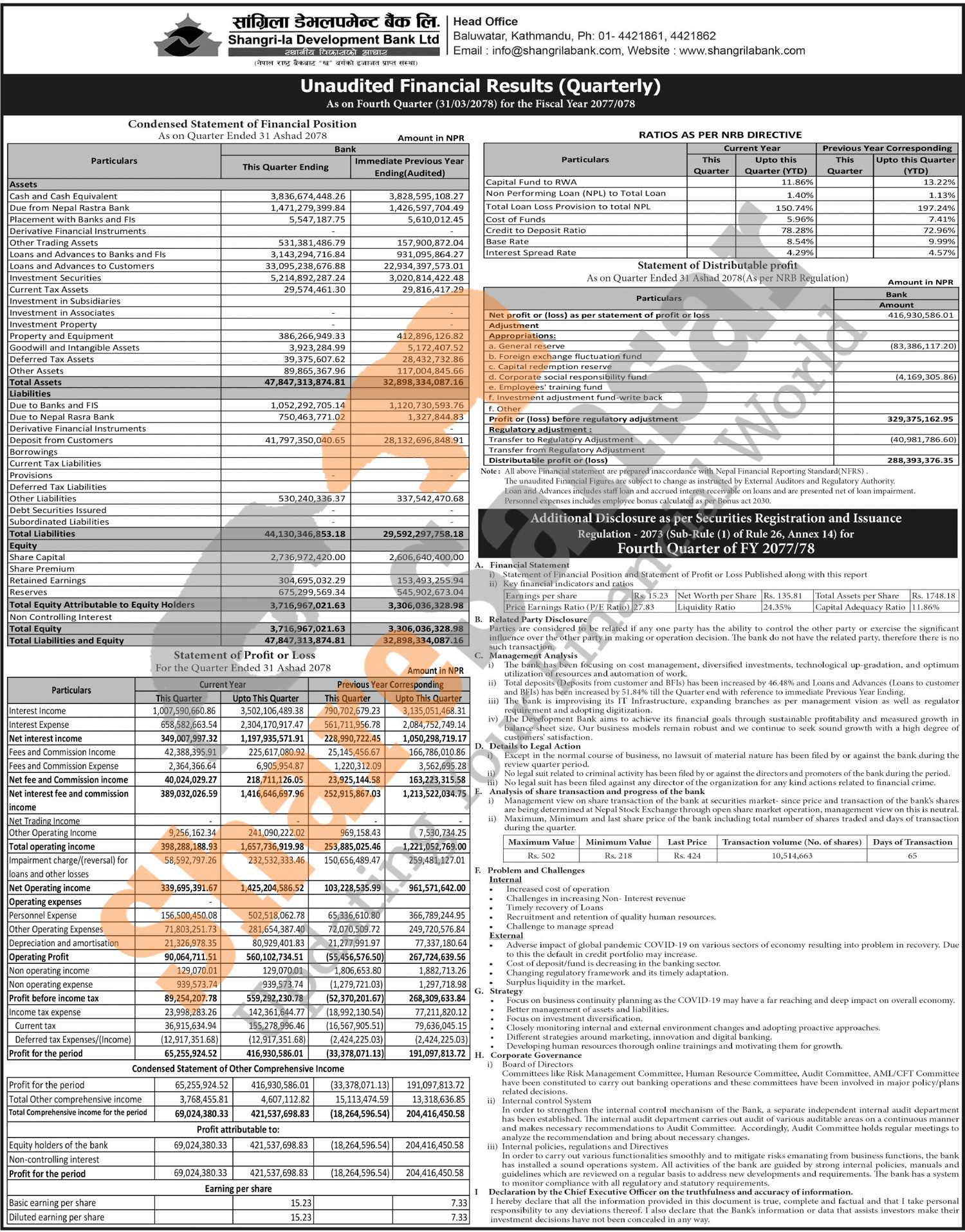 Shangrila Development Bank Limited has posted a net profit of Rs 416.93 million and published its 4th quarter company analysis of the fiscal year 2077/78.