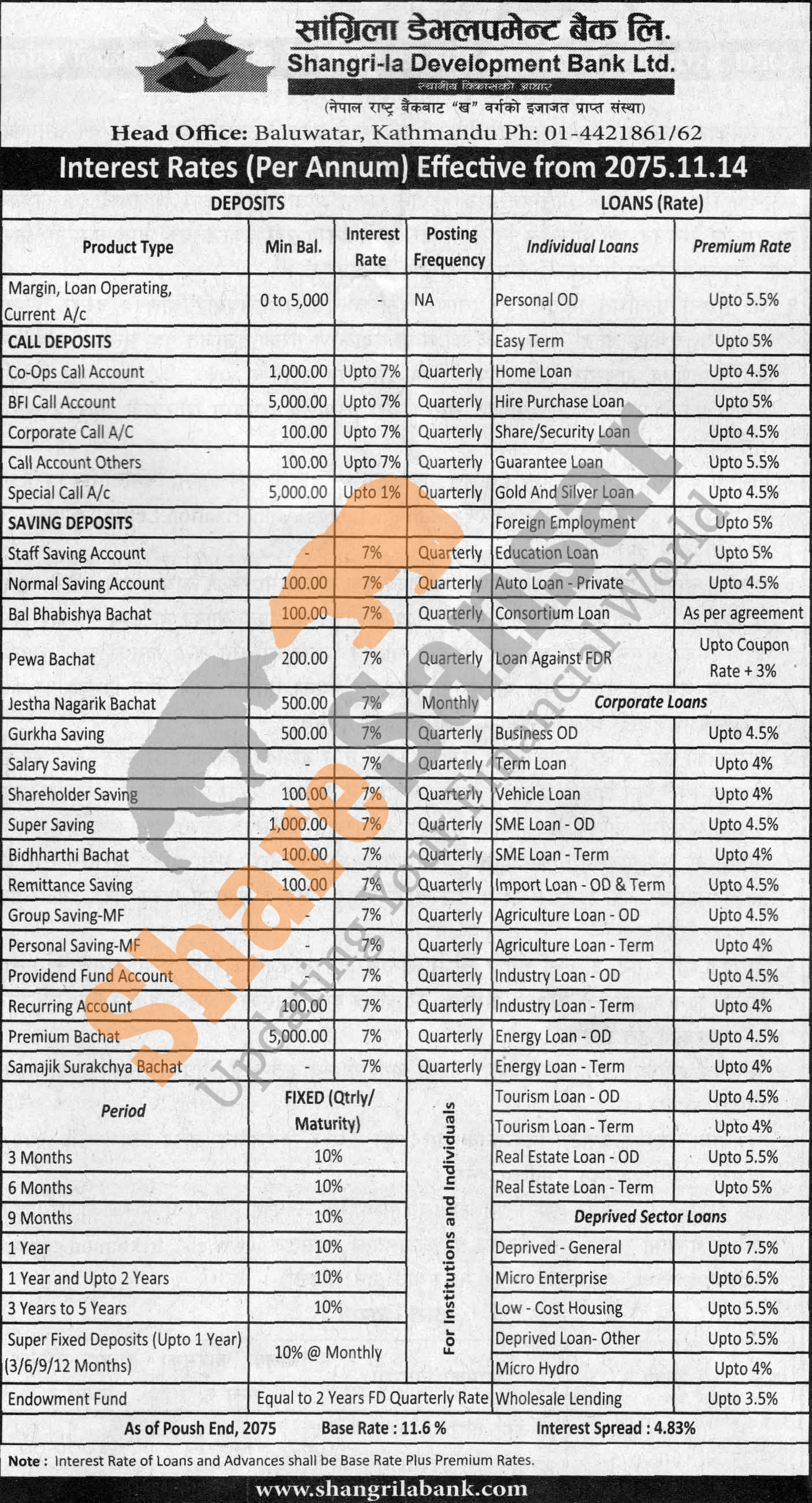 Shangrila Development Bank Limited has published a notice regarding new interest rate and its effective from 14 Falgun, 2075.
