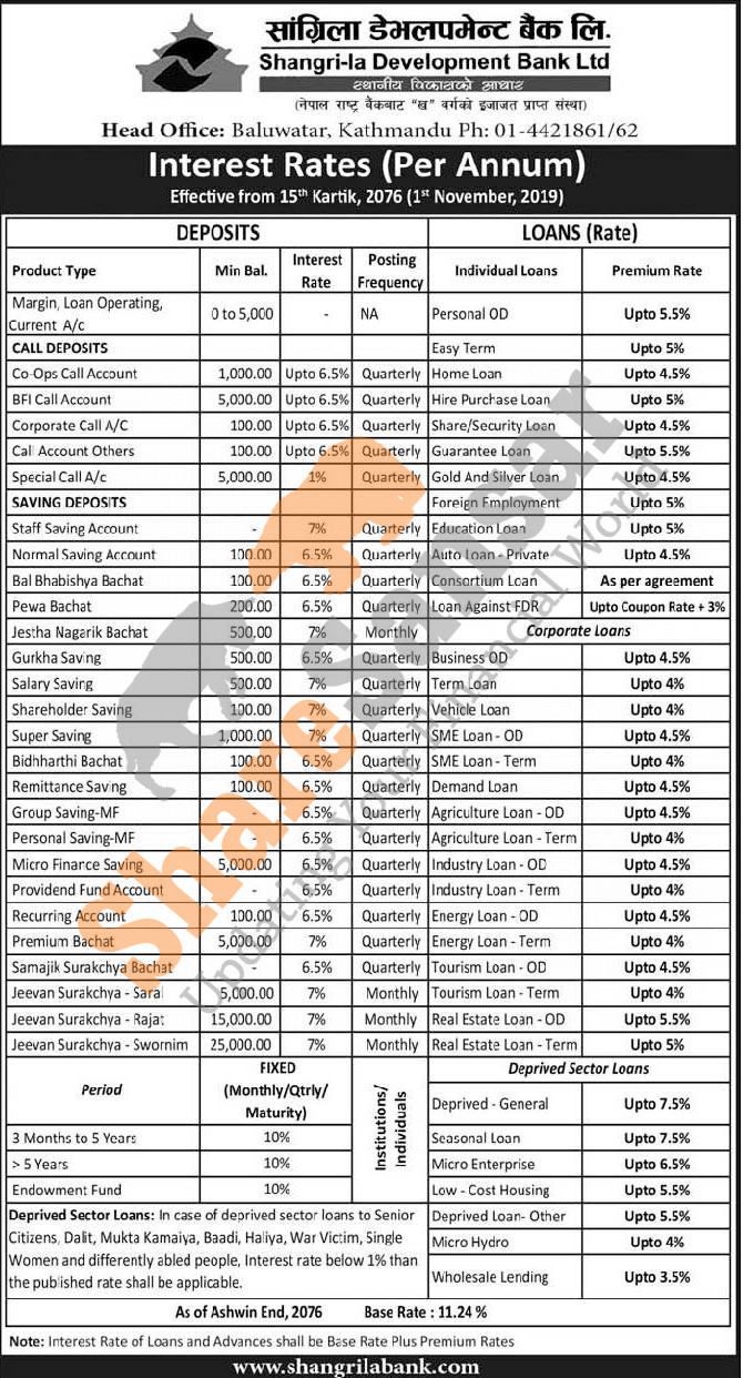 Shangrila Development Bank Limited has published a notice regarding new interest rate and its effective from 15th Kartik, 2076.