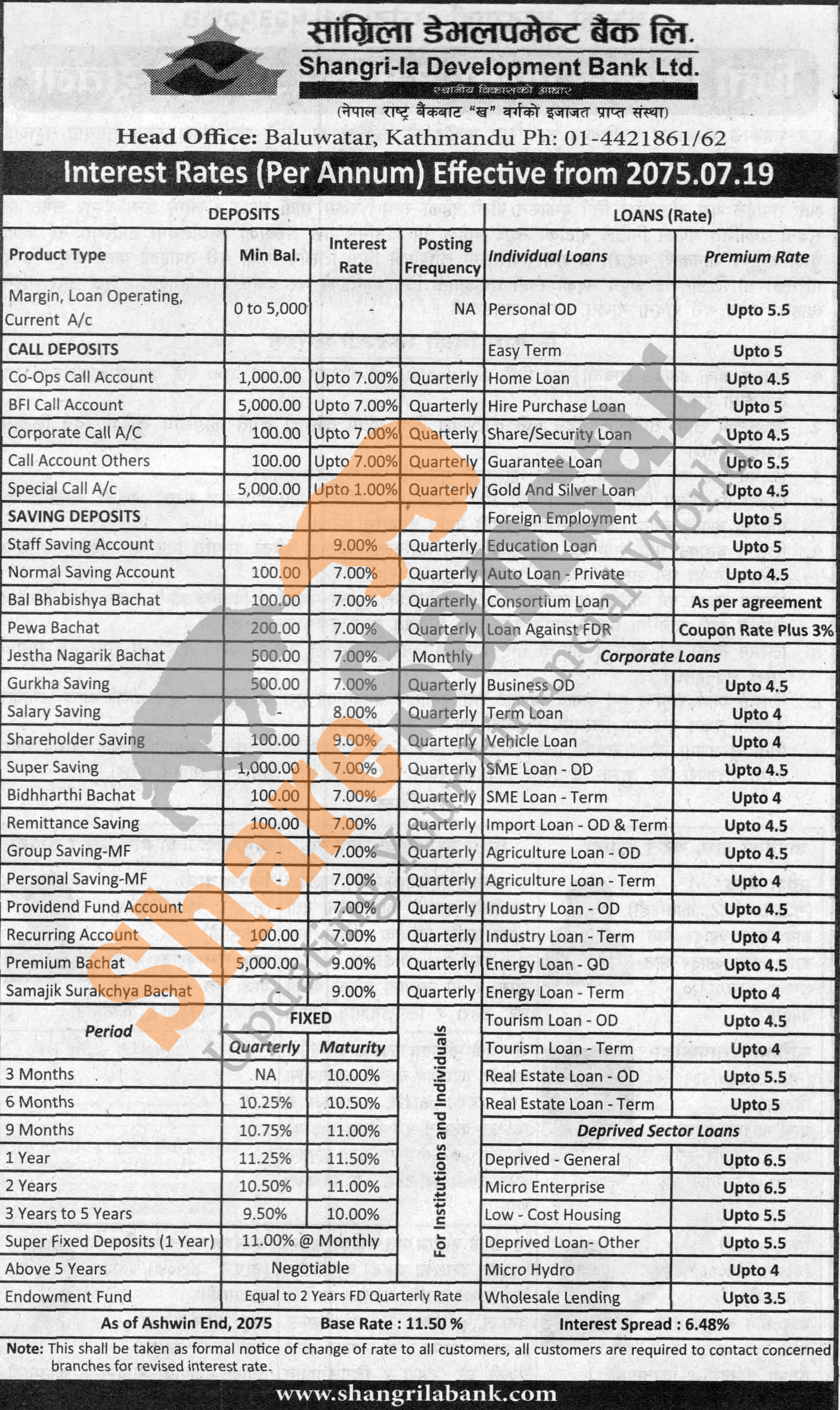 Shangrila Development Bank Limited has published a notice regarding new interest rate and its effective from 19th Kartik, 2075.
