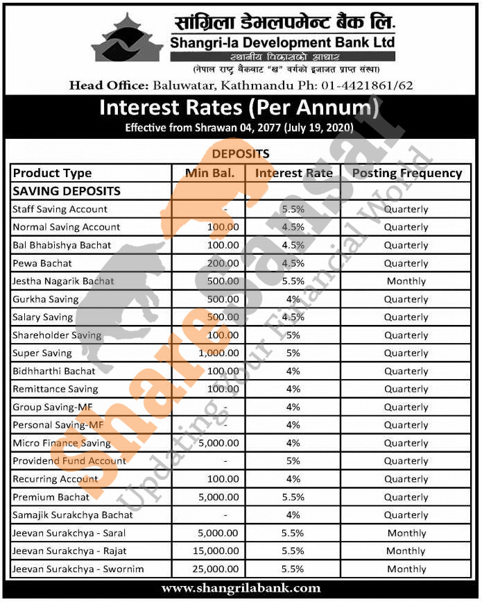 Shangrila Development Bank Limited has published a notice regarding the interest rate on the various deposits and its effective from 4th Shrawan, 2077.