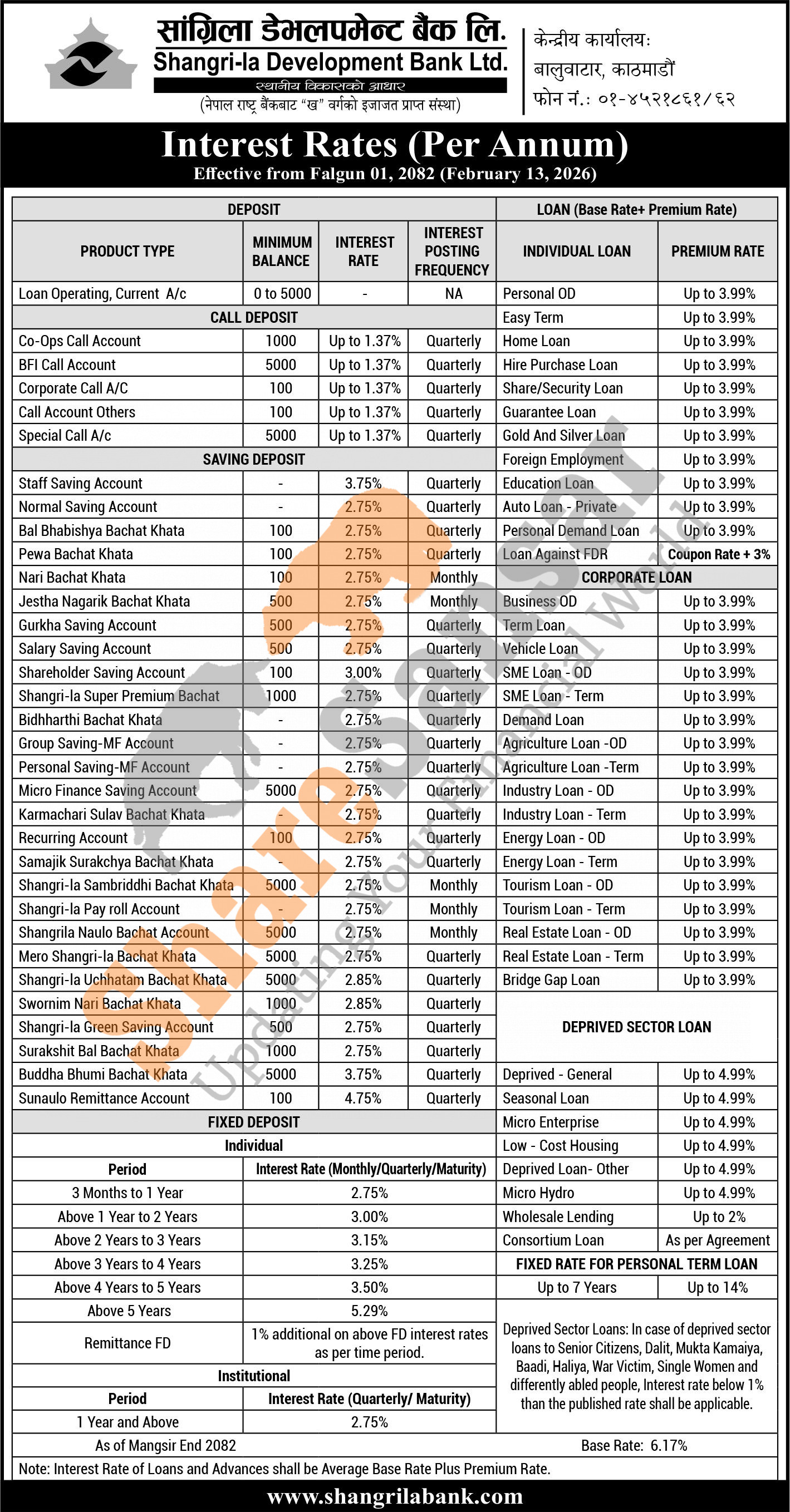 Shangrila Development Bank Limited has published a notice regarding the new interest rate for deposit products and it's effective from 1st Falgun, 2082.