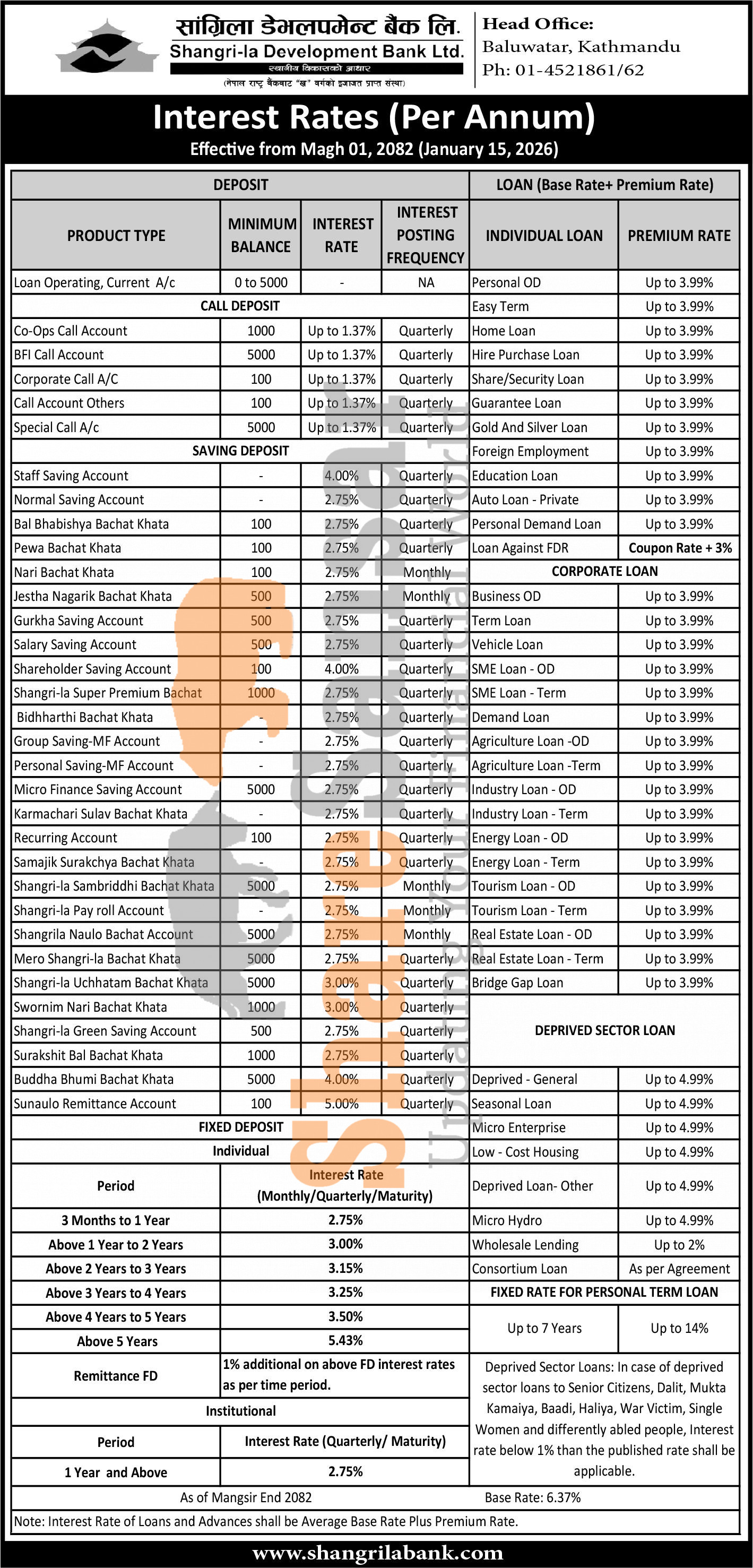 Shangrila Development Bank Limited has published a notice regarding the new interest rate for deposit products and it's effective from 1st Magh, 2082.