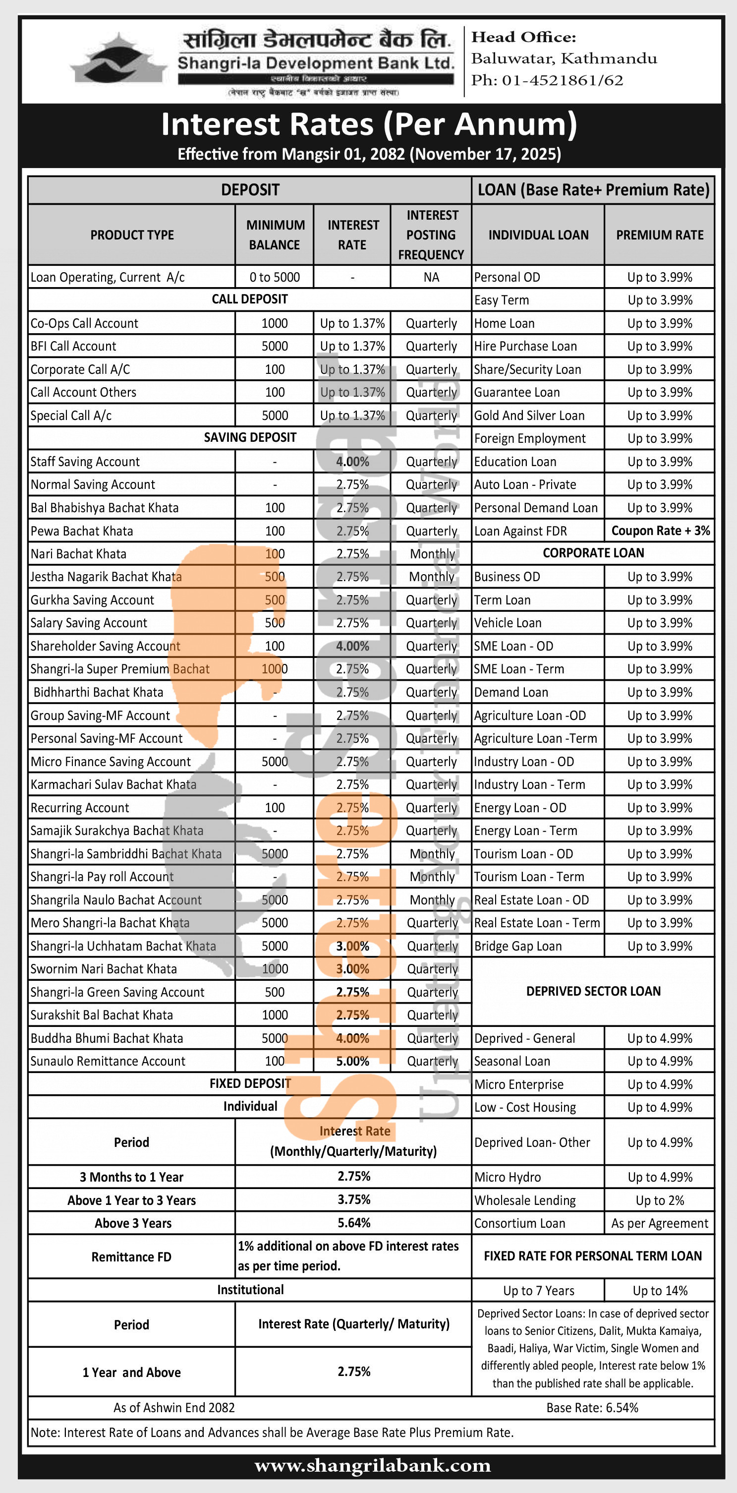 Shangrila Development Bank Limited has published a notice regarding the new interest rate for deposit products and it's effective from 1st Mangsir, 2082.