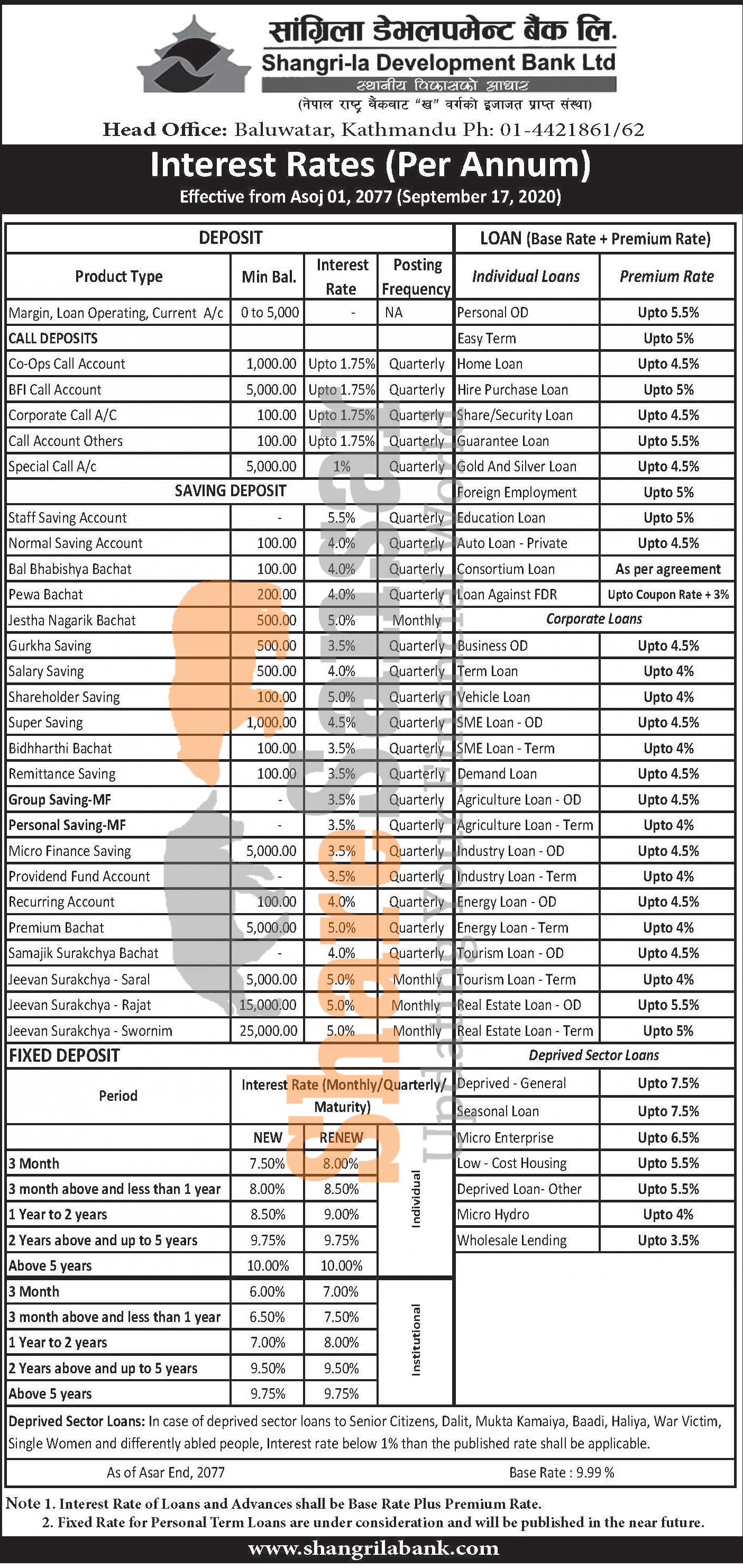 Shangrila Development Bank Limited has published a notice regarding the new interest rate for its deposit and loan product and its effective from 1st Ashwin, 2077.