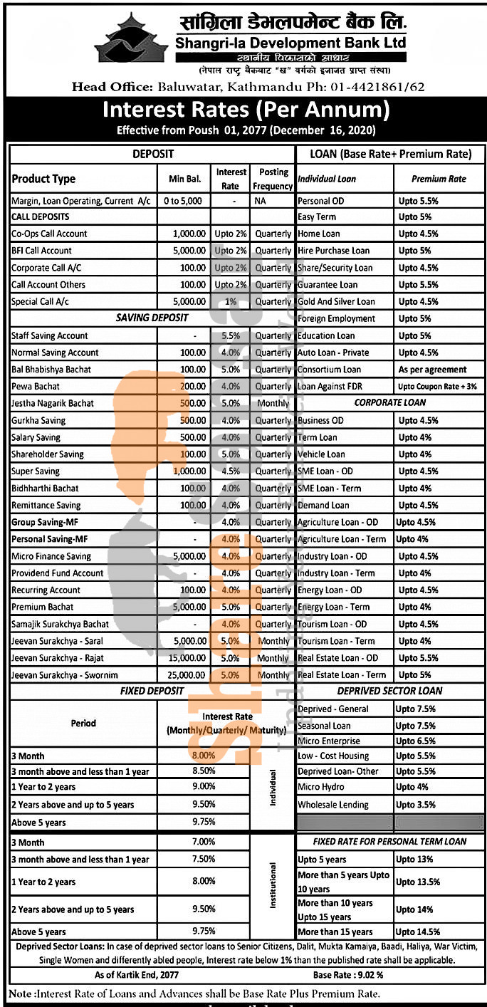 Shangri-la Development Bank Limited has published a notice regarding the new interest rate for its deposit and loan products and it's effective from 1st Poush, 2077.