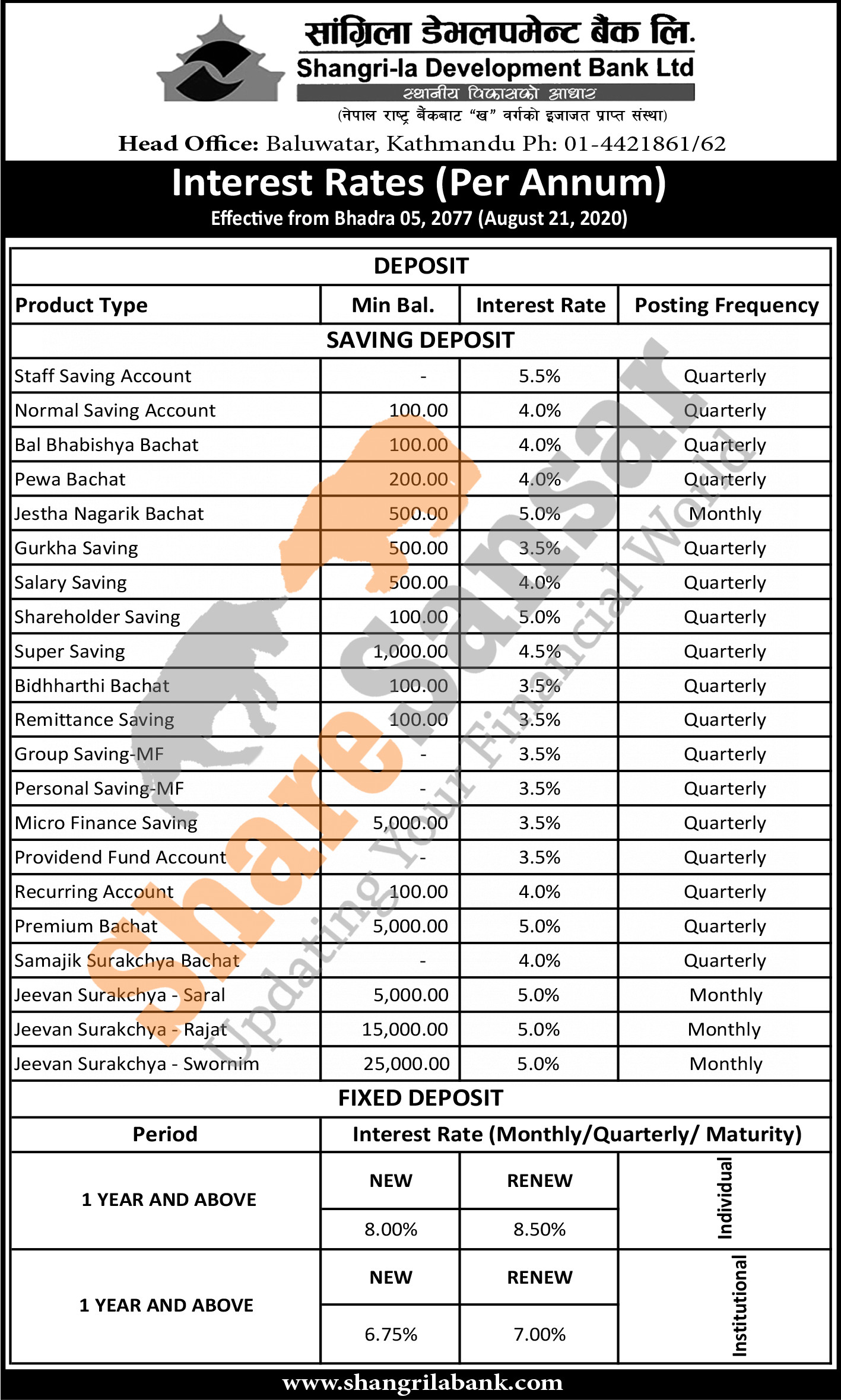 Shangrilla Development Bank Limited has published a notice regarding the new interest rate for its deposit and loan products and its effective from 5th Bhadra, 2077.