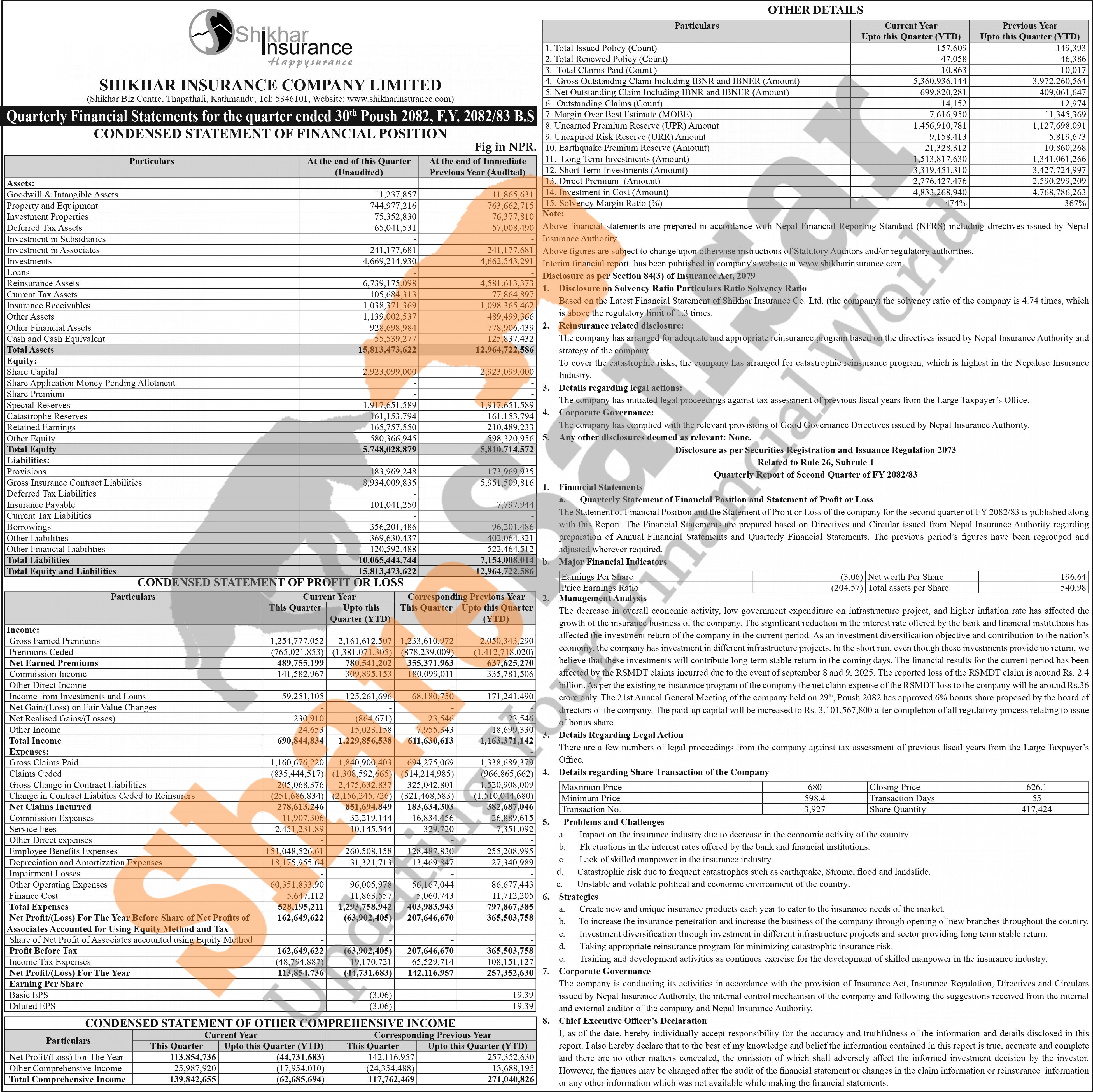 Shikhar Insurance Company Limited has posted a net loss of Rs 44.73 million and published its 2nd quarter company analysis of the fiscal year 2082/83.
