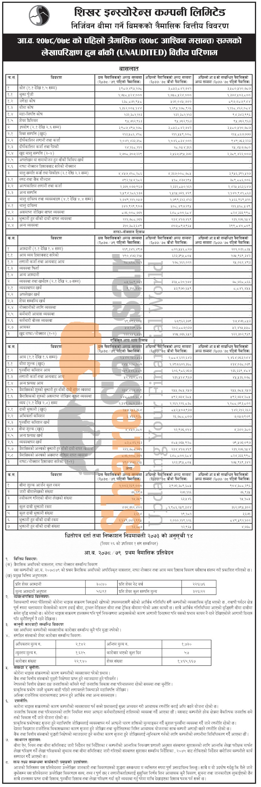 Shikhar Insurance Company Limited has posted a net profit of Rs 133.65 million and published its 1st quarter company analysis of the fiscal year 2078/79.