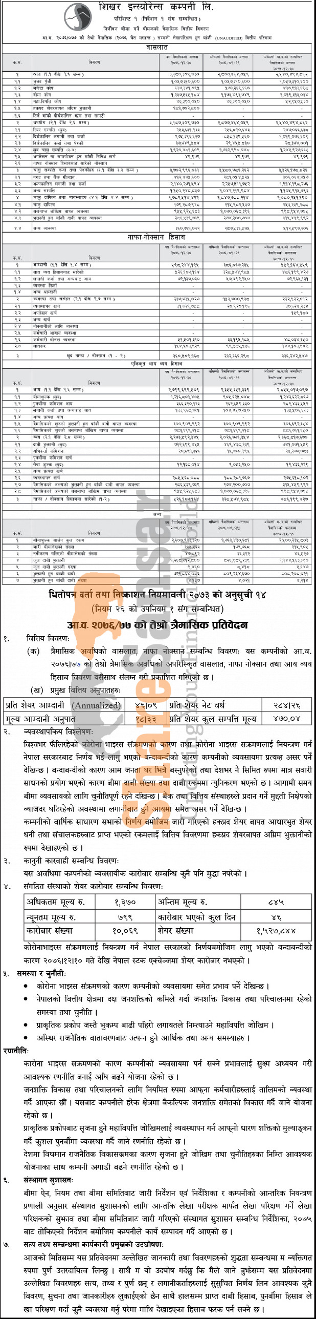 Shikhar Insurance Company Limited has posted a net profit of Rs 360.5 million and published its 3rd quarter company analysis of the fiscal year 2076/77.