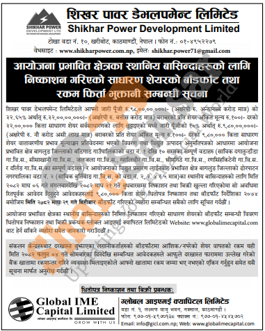 Shikhar Power Development Limited has allotted its 9,80,000 units IPO shares to the project-affected locals of Baglung District on 29th Magh, 2082.
