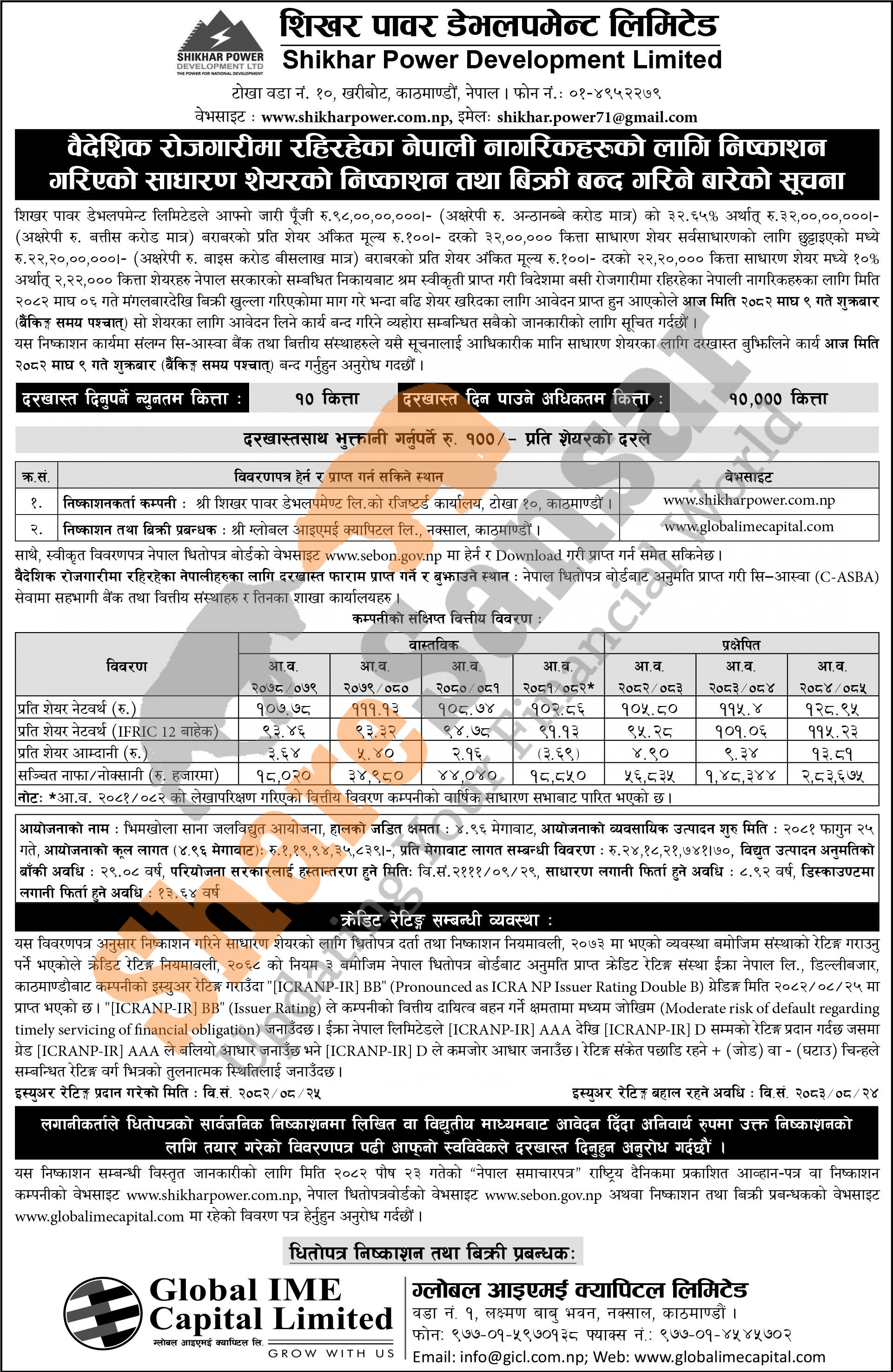Shikhar Power Development Limited is closing its 2,22,000 units IPO Shares to Foreign Nepalese Employees from today (9th Magh, 2082).