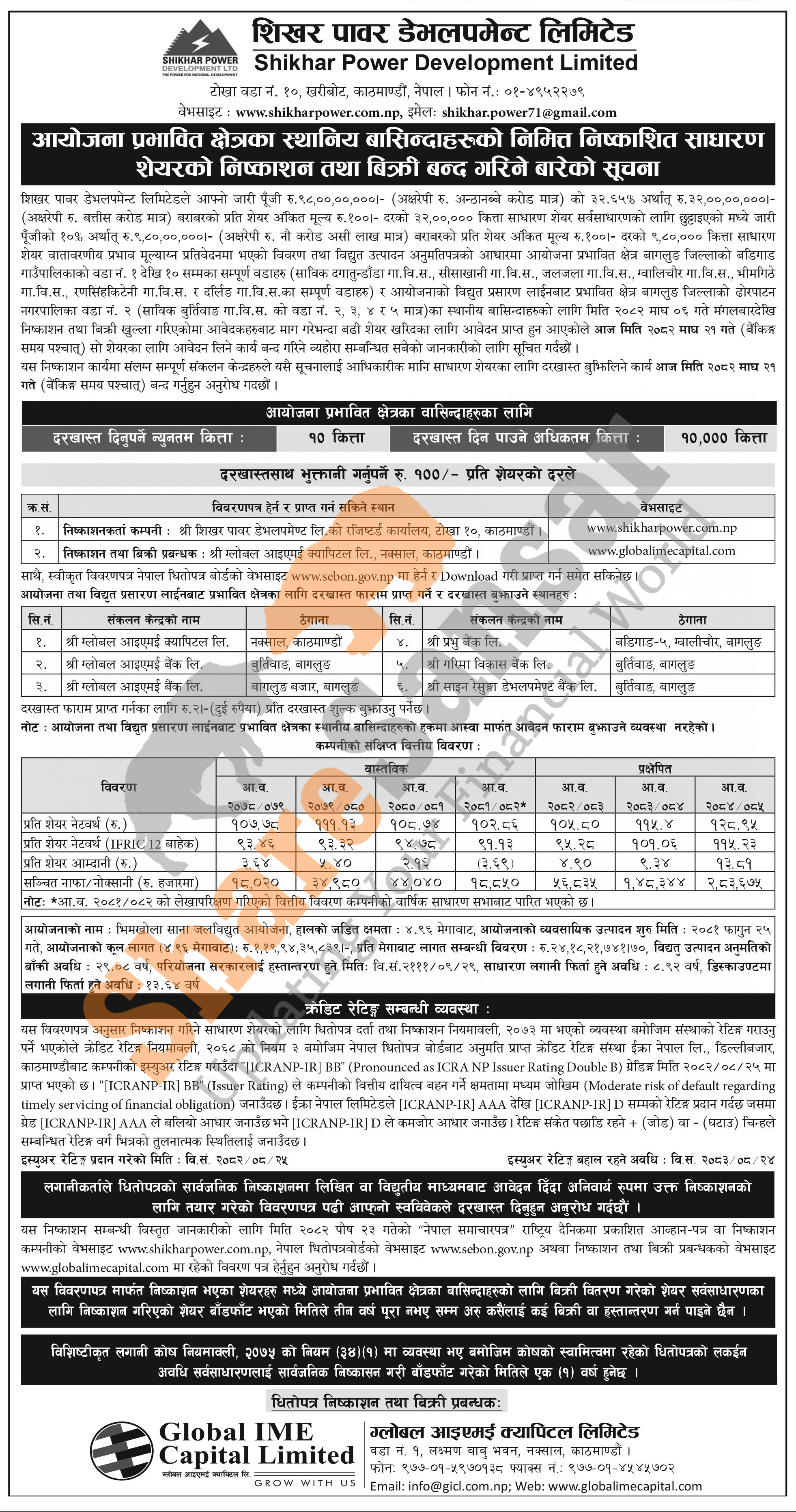 Shikhar Power Development Limited is closing its 9,80,000 units IPO shares to the project-affected locals of Baglung District from today (21st Magh, 2082).