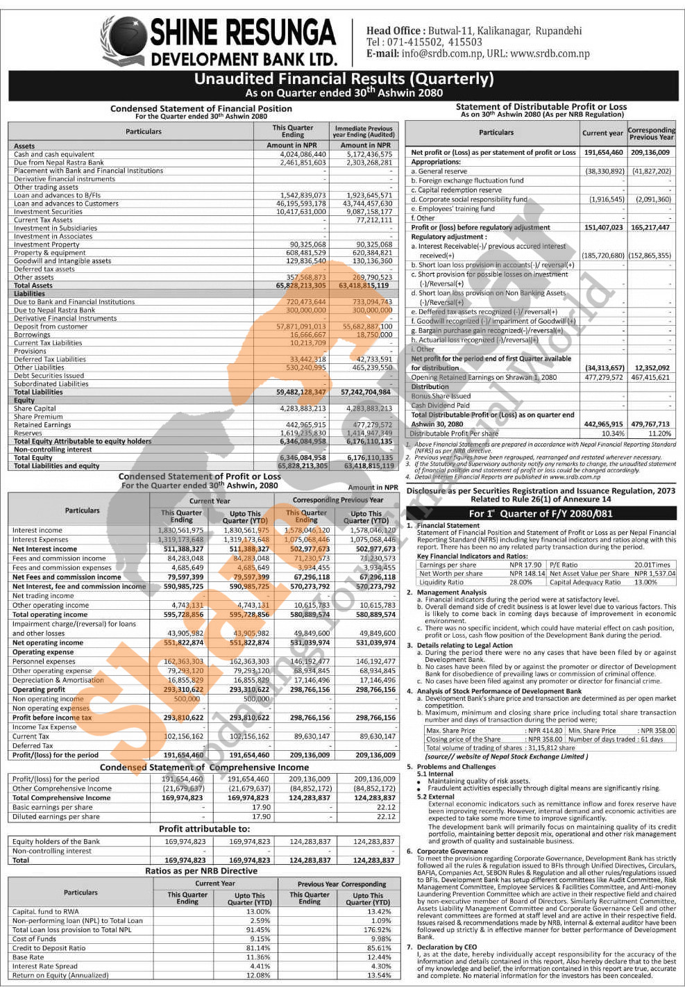 Shine Resunga Development Bank Limited has posted a net profit of Rs 191.65 million and published its 1st quarter company analysis of the fiscal year 2080/81.