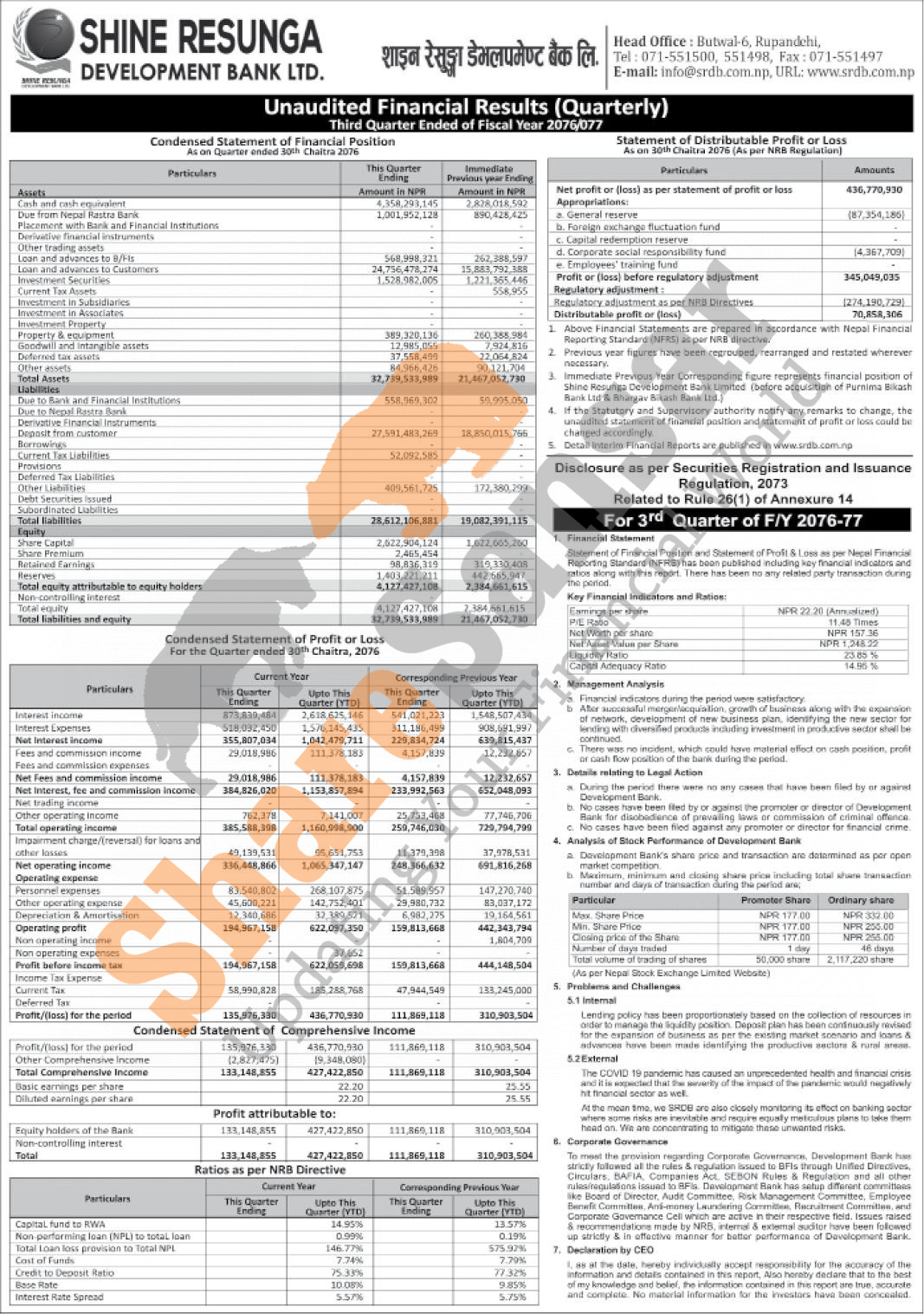 Shine Resunga Development Bank Limited has posted a net profit of Rs 436.77 million and published its 3rd quarter company analysis of the fiscal year 2076/77.