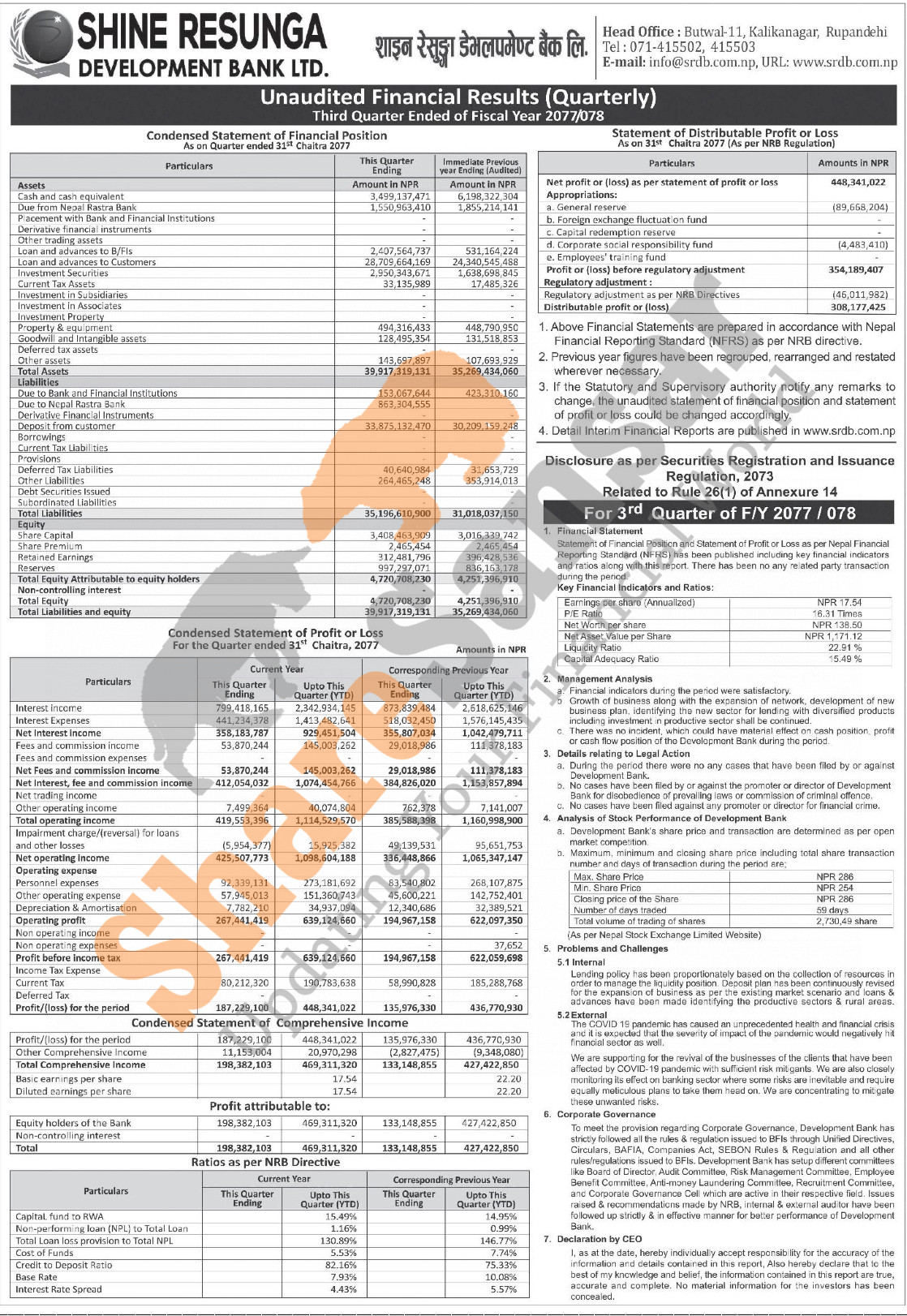 Shine Resunga Development Bank Limited has posted a net profit of Rs 448.34 million and published its 3rd quarter company analysis of the fiscal year 2077/78.