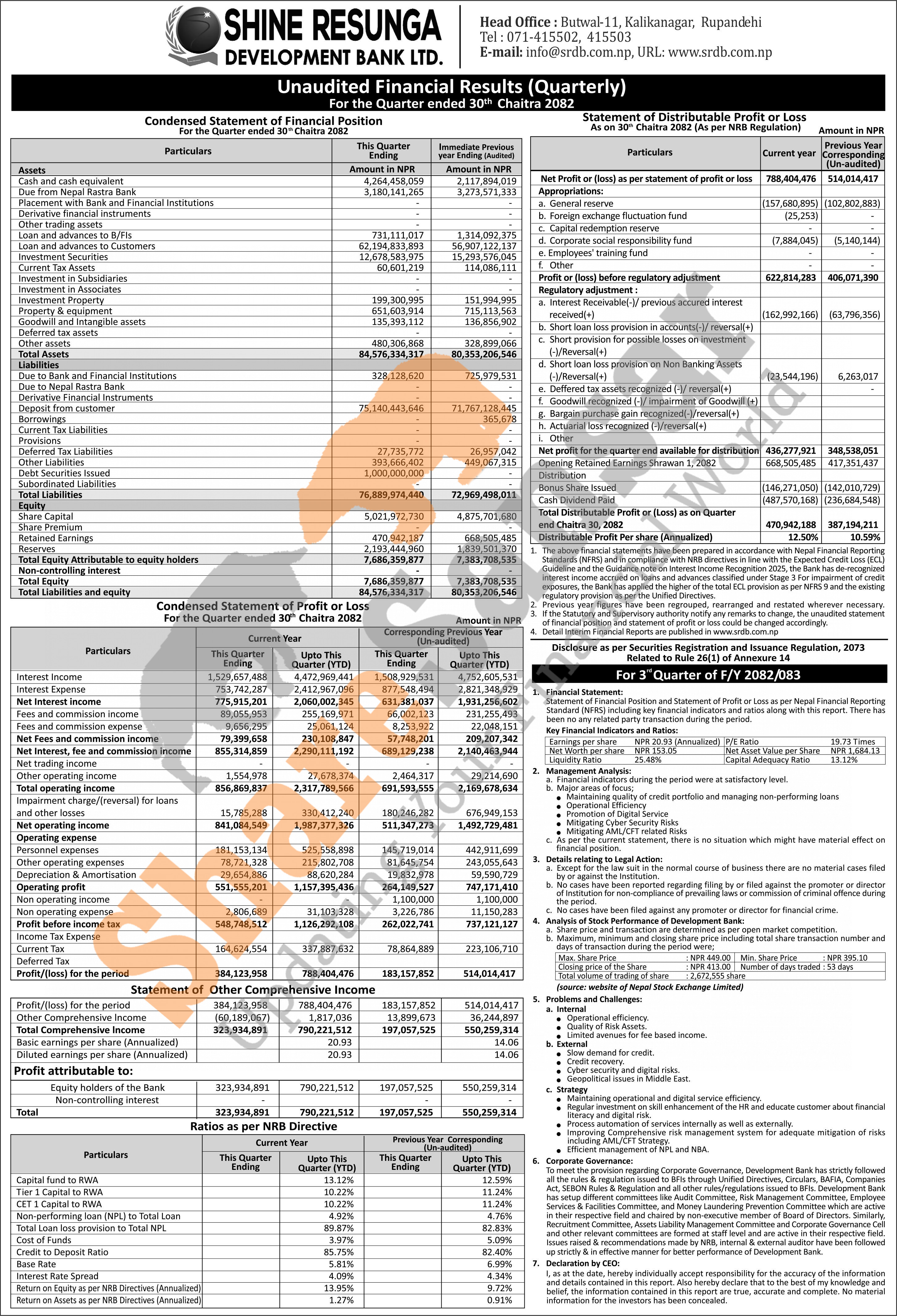 Shine Resunga Development Bank Limited has posted a net profit of Rs 788.40 million and published its 3rd quarter company analysis of the fiscal year 2082/83.