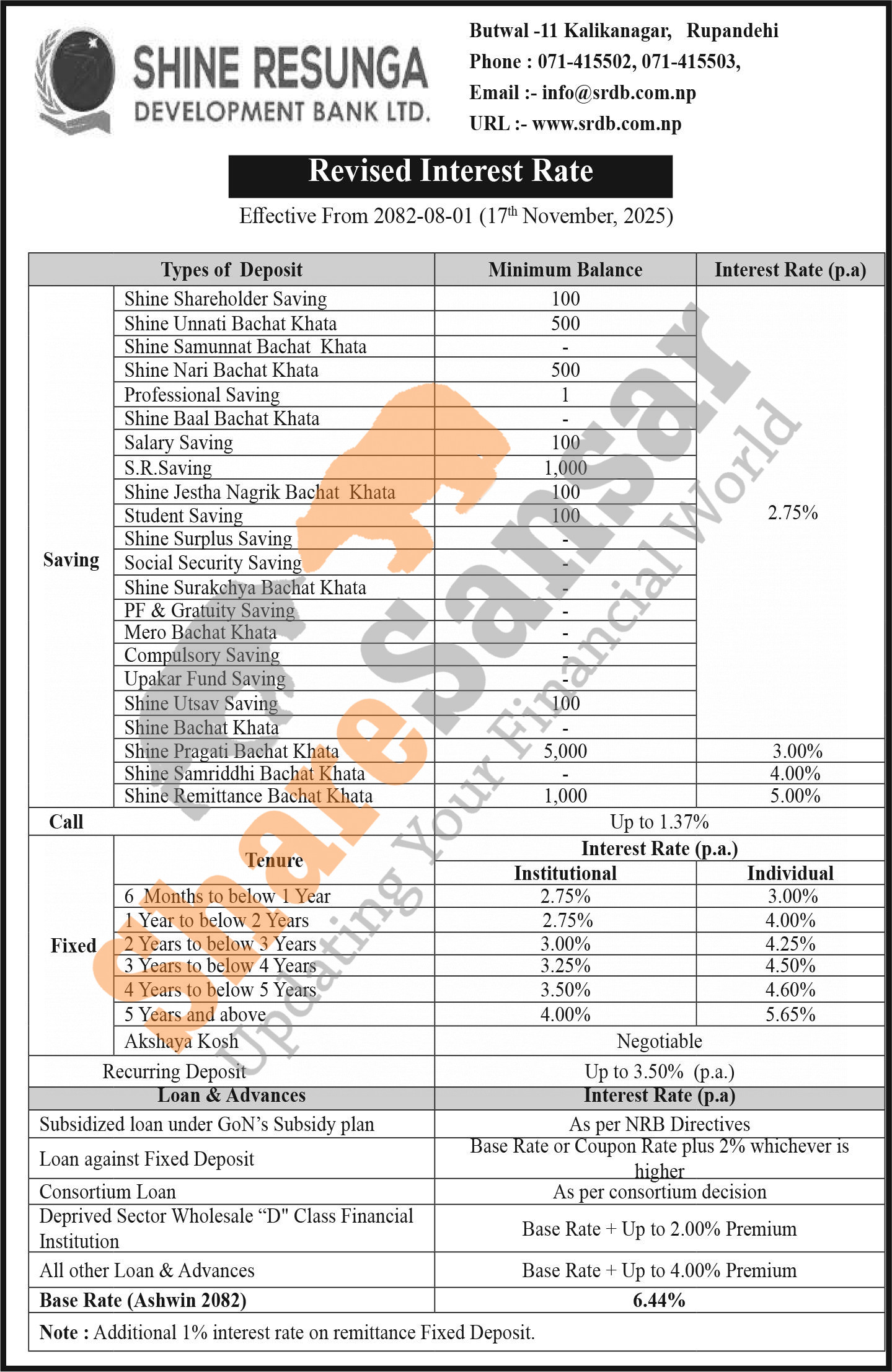 Shine Resunga Development Bank Limited has published a notice regarding the new interest rate for deposit and loan products and it's effective from 1st Mangsir, 2082.