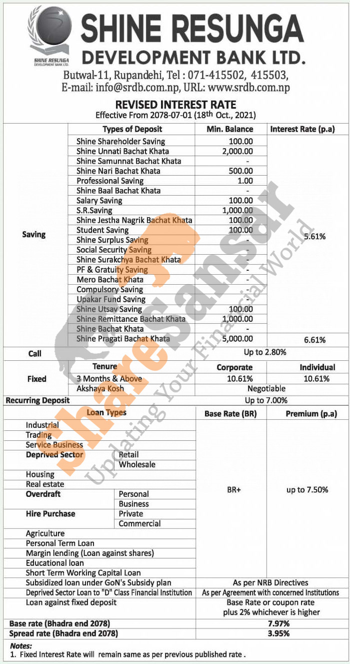 Shine Resunga Development Bank Limited has published a notice regarding the new interest rate for its deposit and loan products and it's effective from 1st Kartik, 2078.