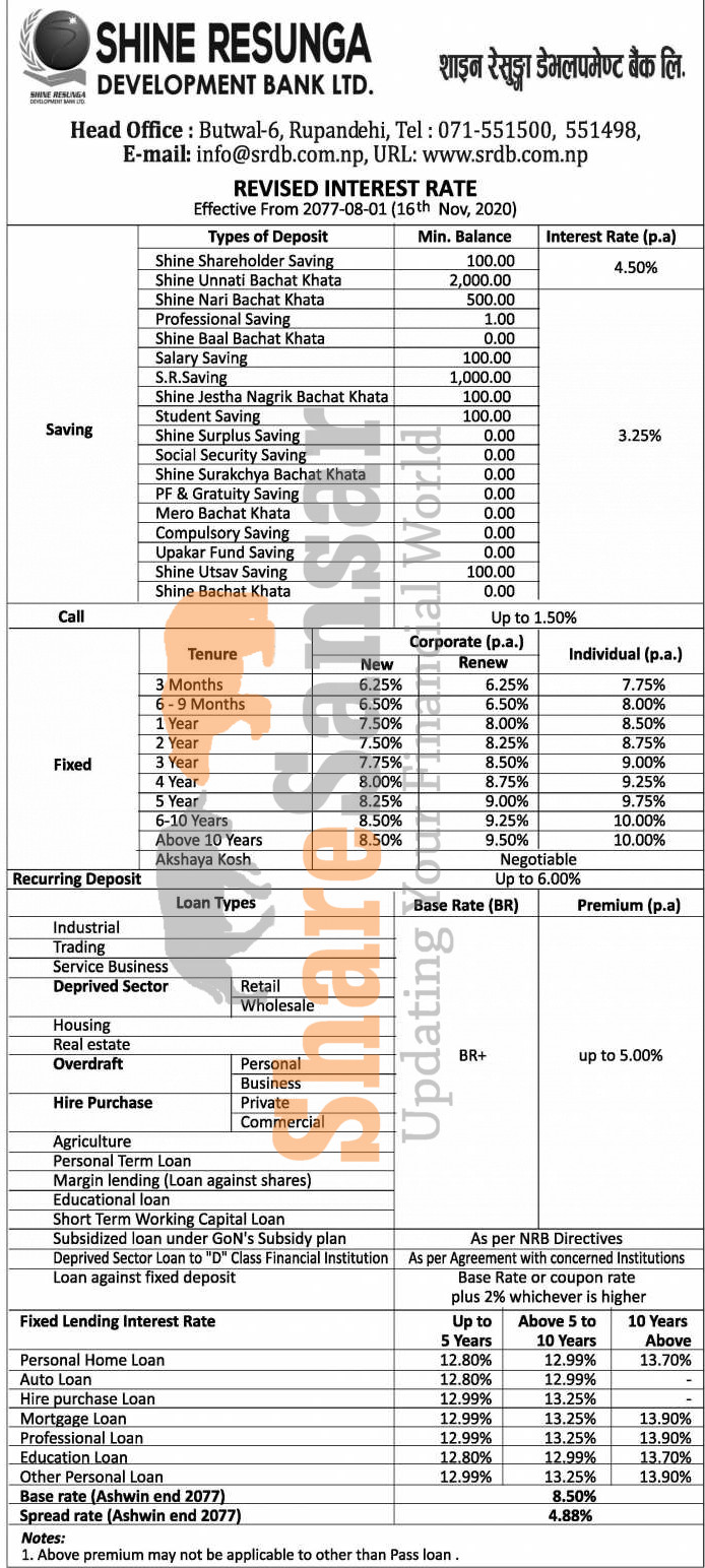 Shine Resunga Development Bank Limited has published a notice regarding the new interest rate for its deposit and loan products and it's effective from 1st Mangsir, 2077.