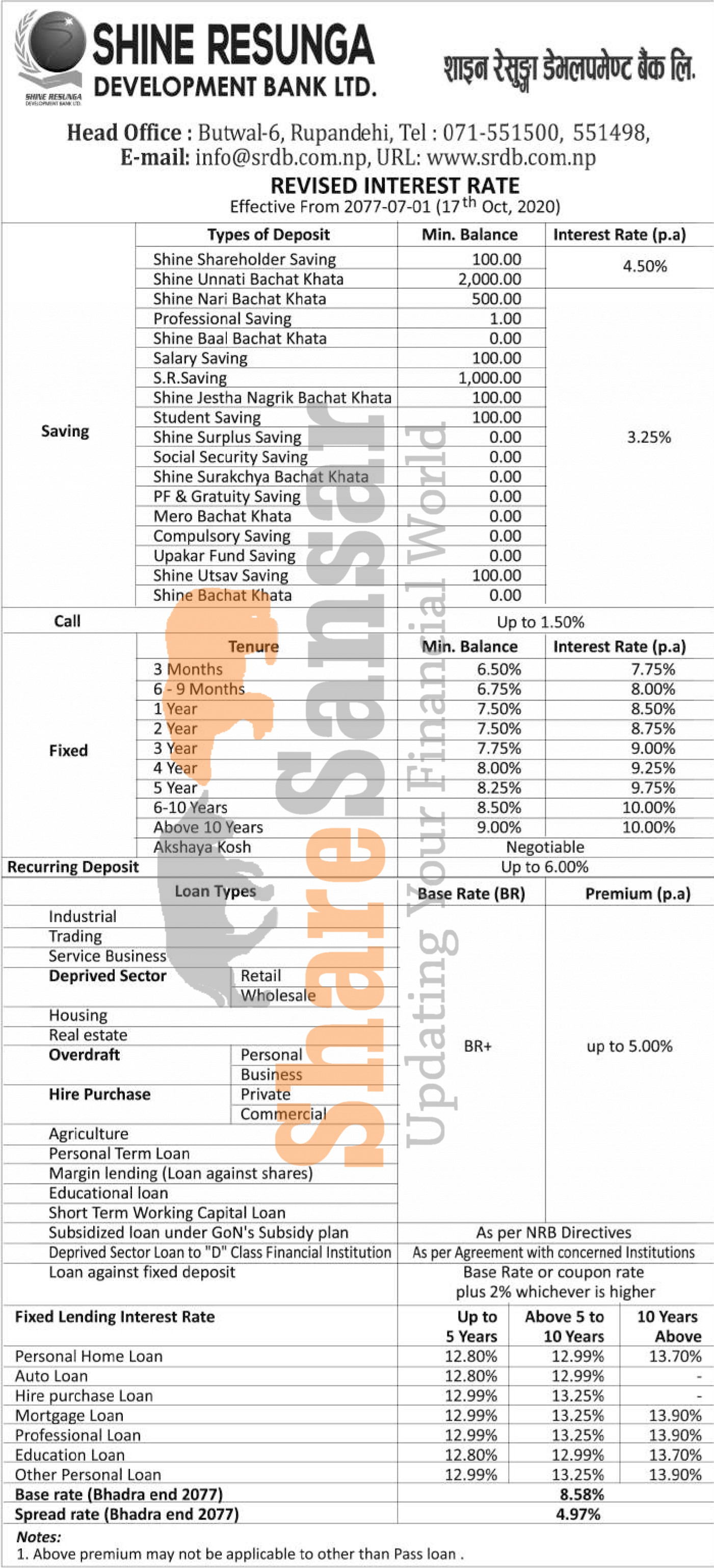 Shine Resunga Development Bank Limited has published a notice regarding the new interest rate for its loan and deposit products and it's effective from 1st Kartik, 2077.