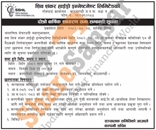 Shiva Shankar Hydro Investment Limited has announced its 2nd AGM going to be held on 29th Mangsir, 2082.