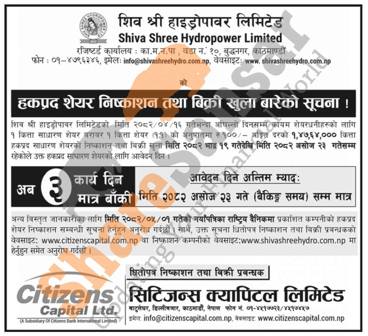 Shiva Shree Hydropower Limited has published a notice regarding 3 days remaining for its ongoing 1:1 ratio right share.