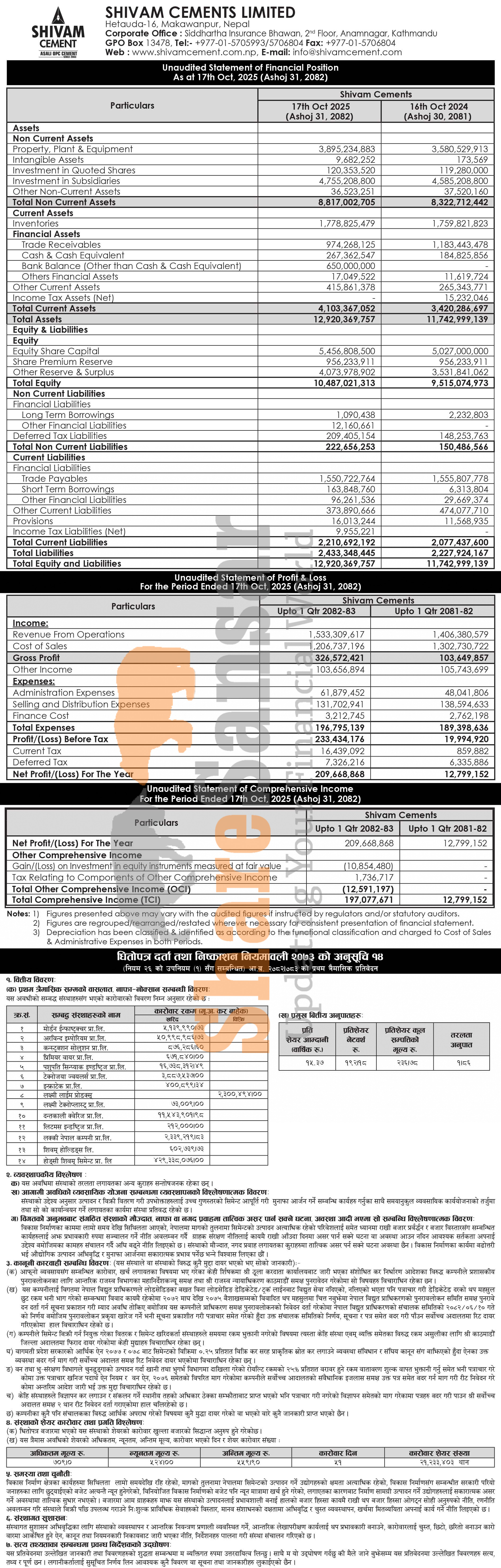 Shivam Cements Limited has posted a net profit of Rs 209.66 million and published its 1st quarter company analysis of the fiscal year 2082/83.