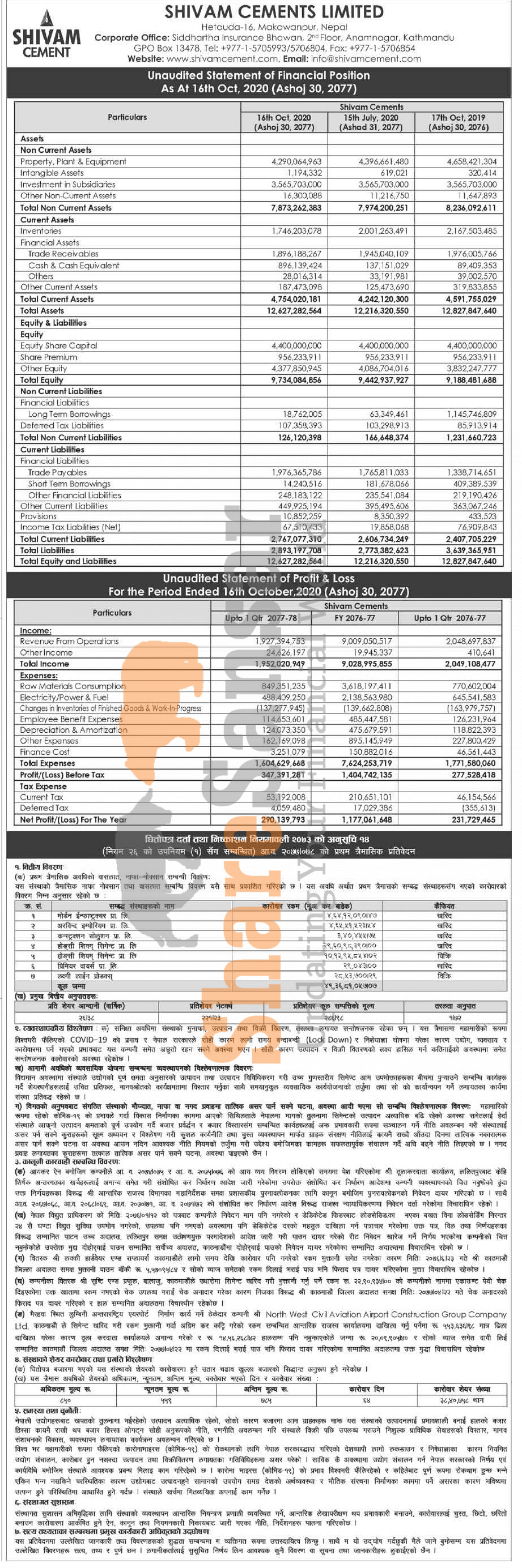 Shivam Cements Limited has posted a net profit of Rs 290.13 million and published its 1st quarter company analysis of the fiscal year 2077/78.