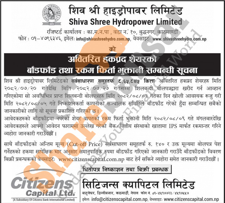Shivashree Hydropower Limited has allotted its 8,65,845 units of ordinary shares (unsold right shares) in an auction to the interested person/company/institutions on 5th Mangsir, 2082 and also has published a notice regarding its auction cut-off price.