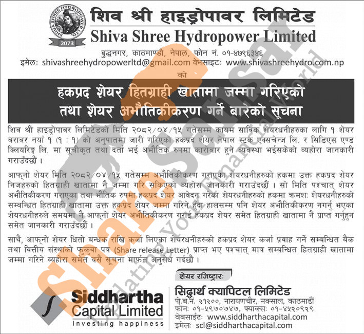 Shivashree Hydropower Limited has distributed its 1:1 ratio 1,47,64,000 units right share directly to DEMAT accounts of its shareholders and has urged to dematerialize their shares.