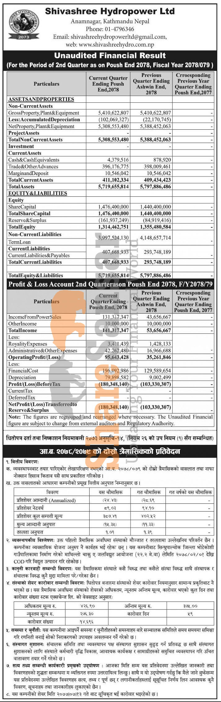 Shivashree Hydropower Limited has posted a net loss of Rs 180.34 million and published its 2nd quarter company analysis of the fiscal year 2078/79.
