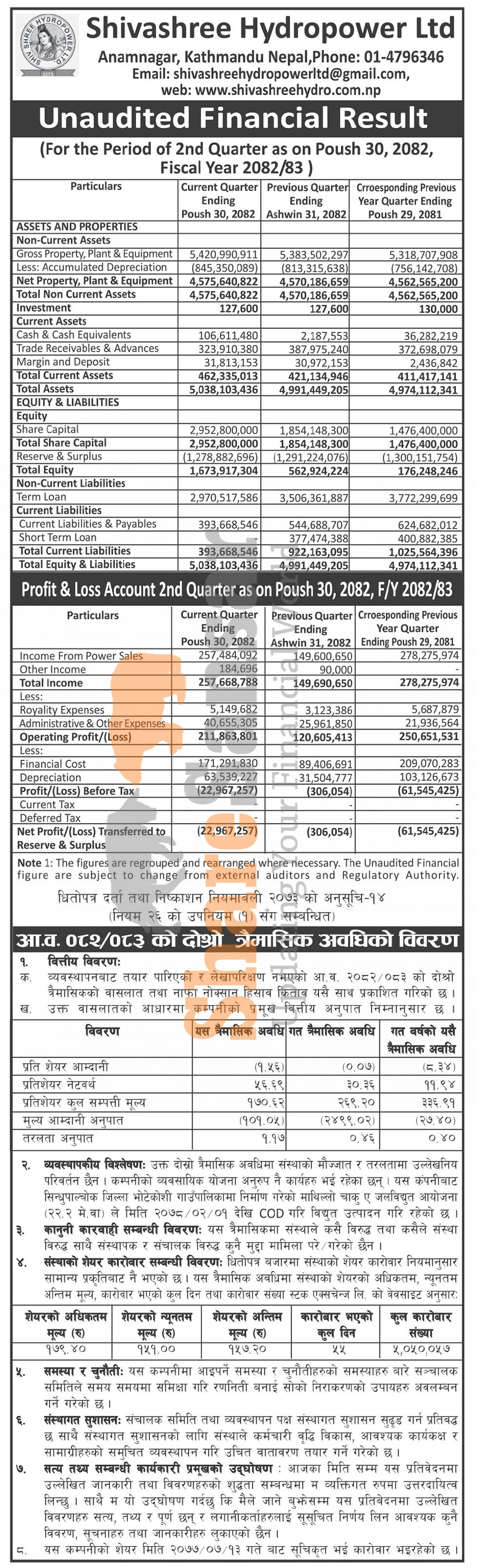 Shivashree Hydropower Limited has posted a net loss of Rs 22.96 million and published its 2nd quarter company analysis of the fiscal year 2082/83.
