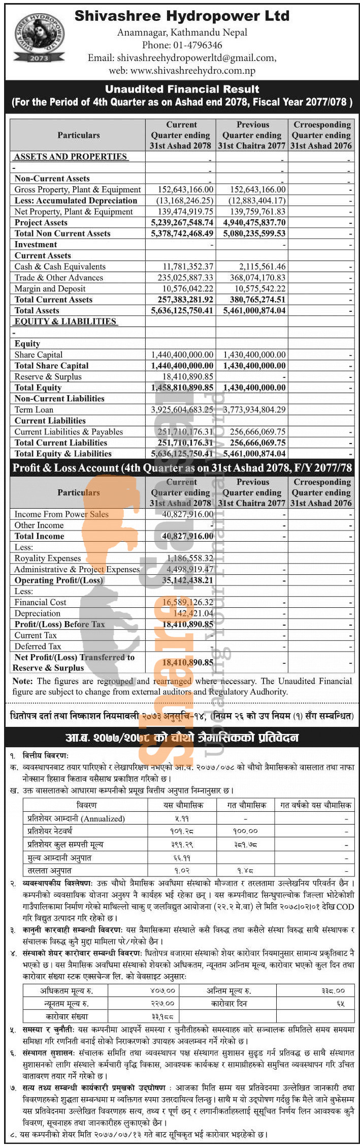 Shivashree Hydropower Limited has posted a net profit of Rs 18.41 million and published its 4th quarter company analysis of the fiscal year 2077/78.