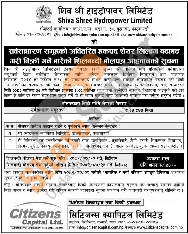 Shivashree Hydropower Limited has published a deadline notice of its upcoming auction of 8,65,845 units of ordinary shares (unsold right shares) on 27th Kartik, 2082.