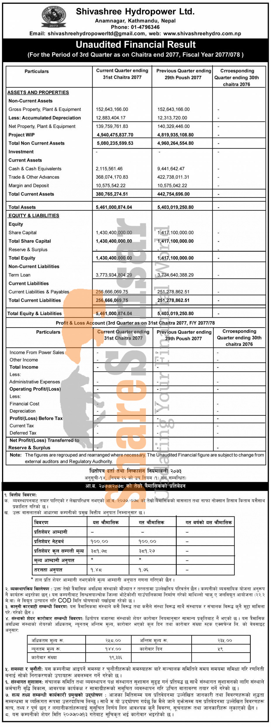 Shivashree Hydropower Limited has published its 3rd quarter company analysis of the fiscal year 2077/78.