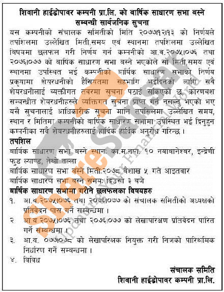 Shivani Hydropower Company Limited has announced its AGM going to be held on 5th Baisakh, 2078.