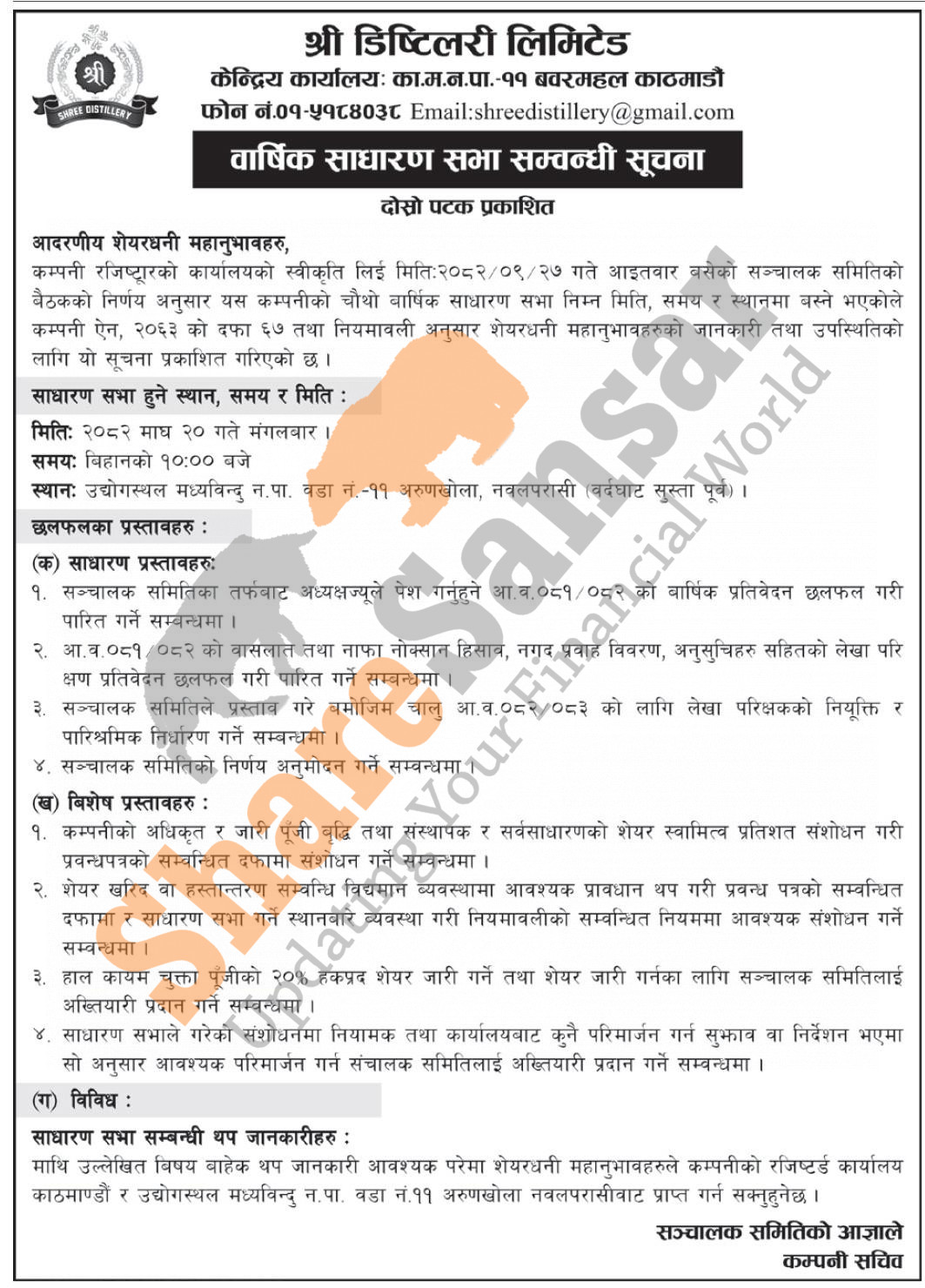 Shree Distillery Limited has announced its 4th AGM going to be held on 20th Magh, 2082.