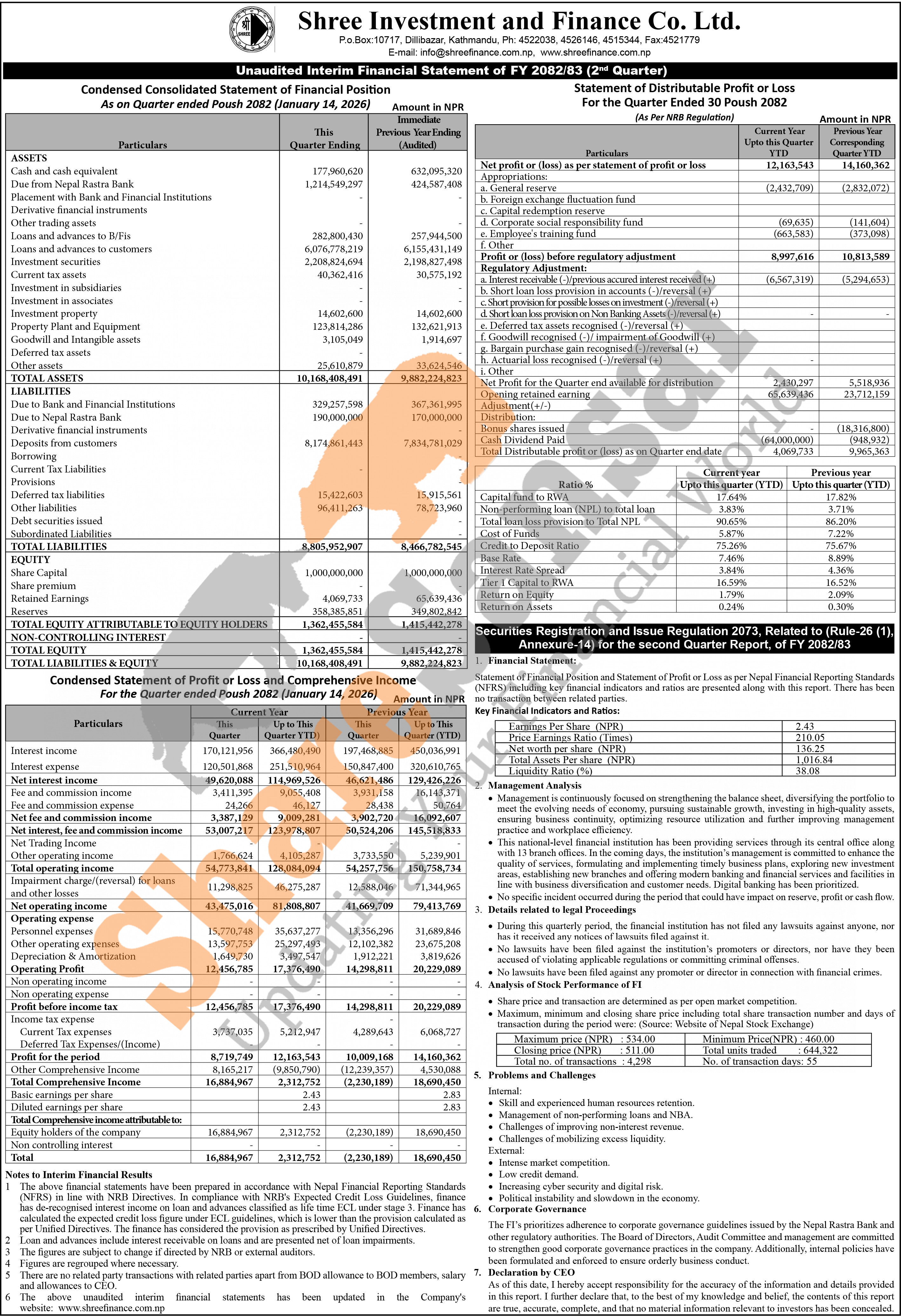 Shree Investment and Finance Company Limited has posted a net profit of Rs 12.16 million and published its 2nd quarter company analysis of the fiscal year 2082/83.