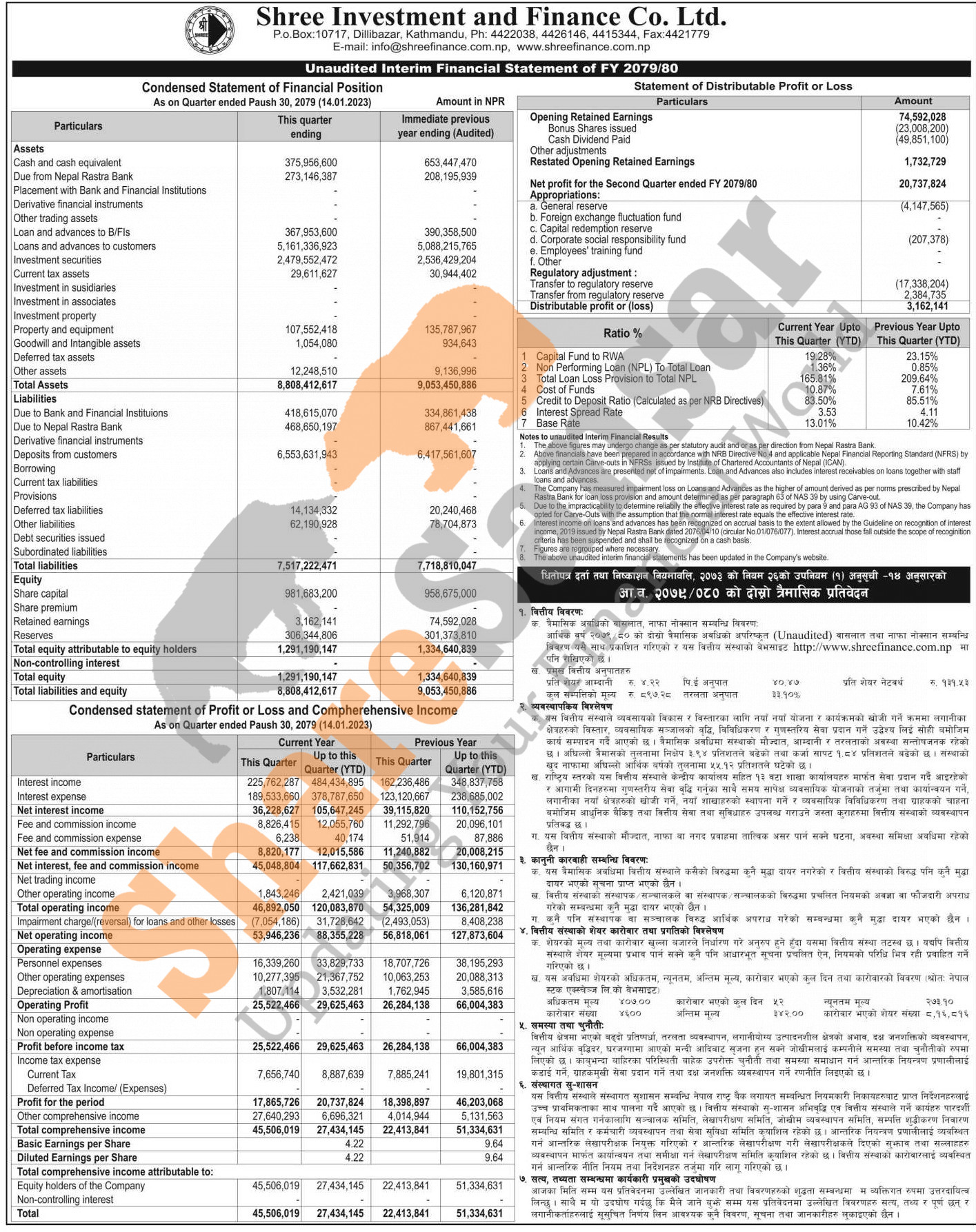 Shree Investment and Finance Company Limited has posted a net profit of Rs 20.73 million and published its 2nd quarter company analysis of the fiscal year 2079/80.