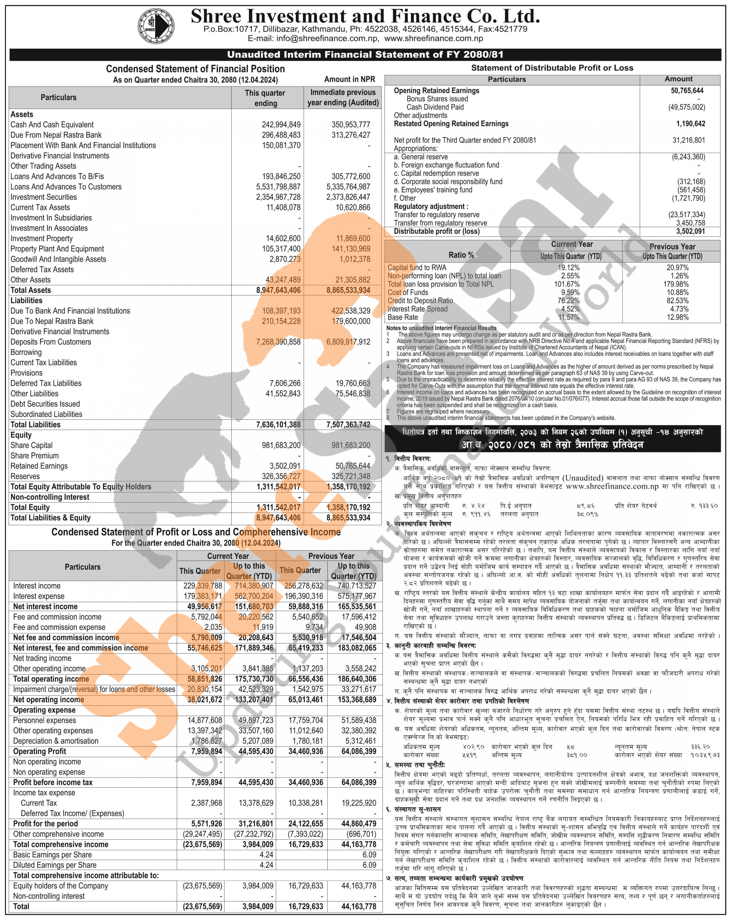 Shree Investment and Finance Company Limited has posted a net profit of Rs 31.21 million and published its 3rd quarter company analysis of the fiscal year 2080/81.