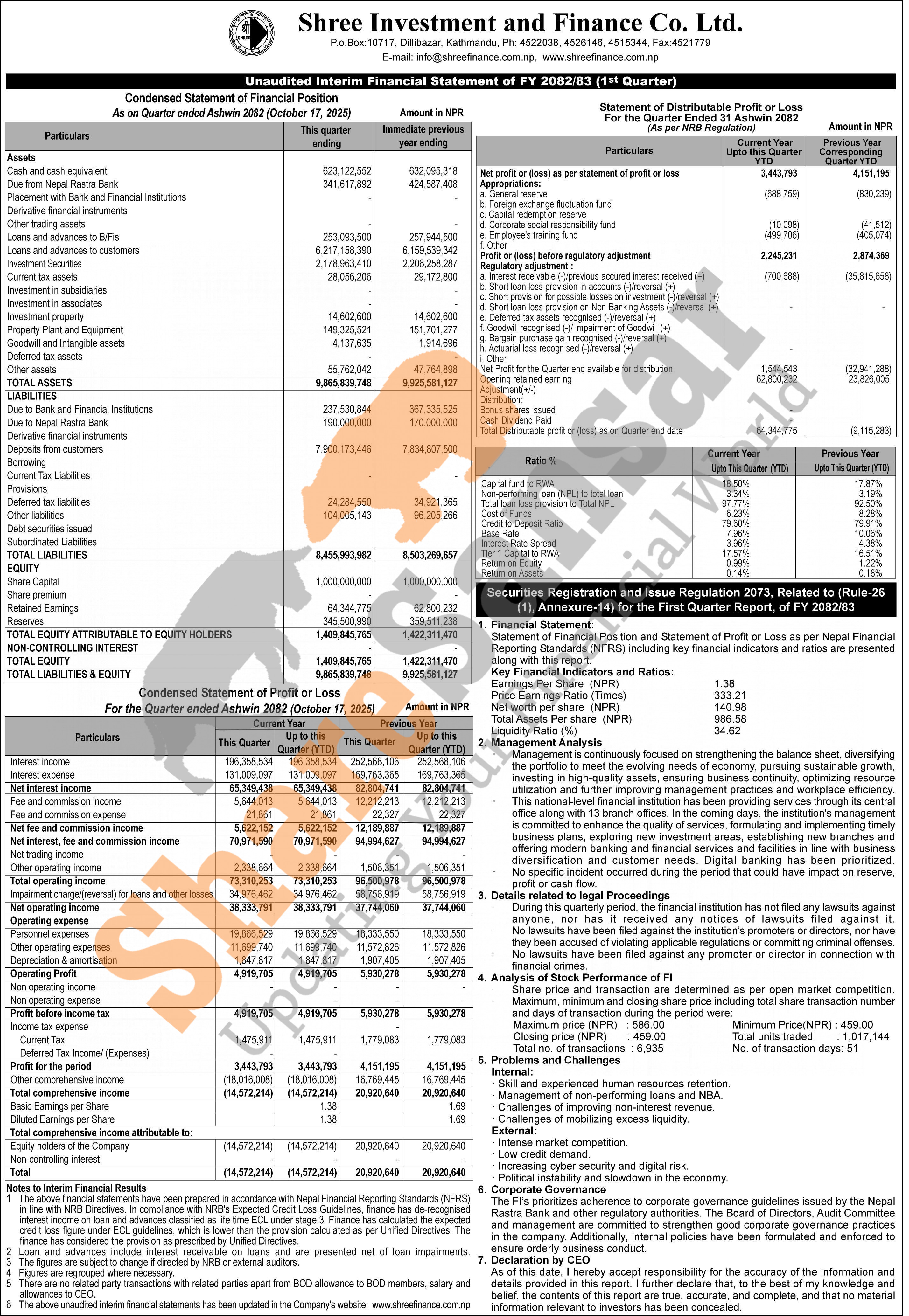Shree Investment and Finance Company Limited has posted a net profit of Rs 3.44 million and published its 1st quarter company analysis of the fiscal year 2082/83.