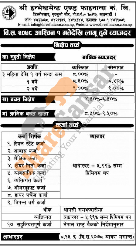 Shree Investment and Finance Company Limited has published a notice regarding the new interest rate for deposit and loan products and it's effective from 1st Ashoj, 2078.