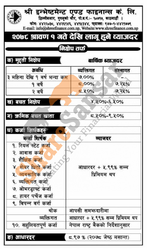 Shree Investment and Finance Company Limited has published a notice regarding the new interest rate for deposit and loan products and it's effective from 1st Shrawan, 2078.