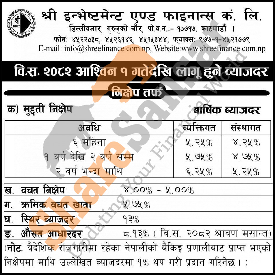 Shree Investment Finance Company Limited has published a notice regarding the new interest rate for deposit and loan products and it's effective from 1st Ashwin, 2082.