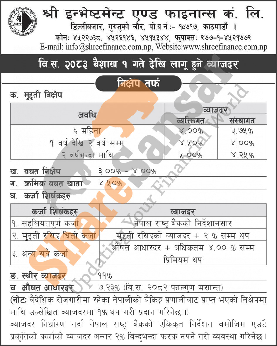 Shree Investment Finance Company Limited has published a notice regarding the new interest rate for deposit and loan products and it's effective from 1st Baisakh, 2083.