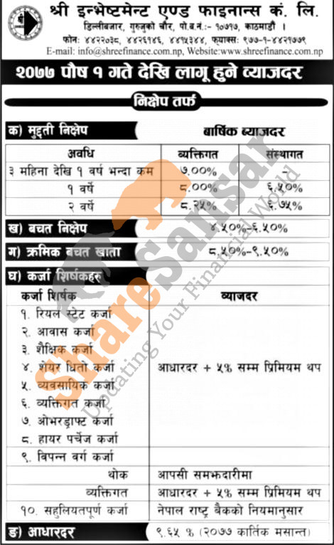 Shree Investment Finance Company Limited has published a notice regarding the new interest rate for its deposit and loan products and it's effective from 1st Poush, 2077.