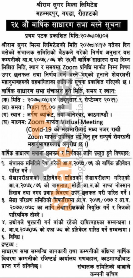 Shree Ram Sugar Mills Limited has announced its 25th AGM going to be held on 24th Bhadra, 2078.